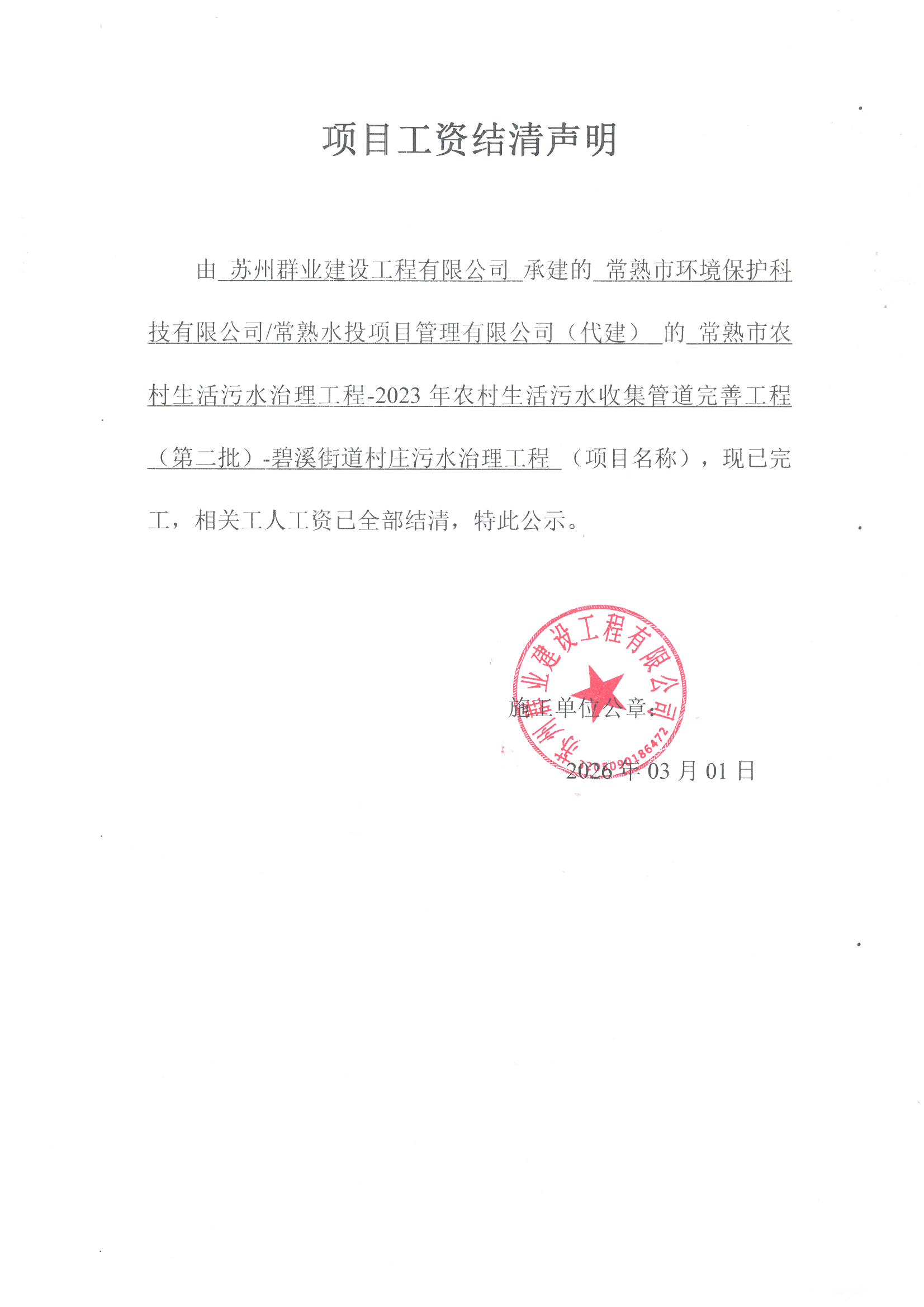 苏州群业建设工程有限公司常熟市农村生活污水治理工程-2023 年农村生活污水收集管道完善工程(第二批)-碧溪街道村庄污水治理工程