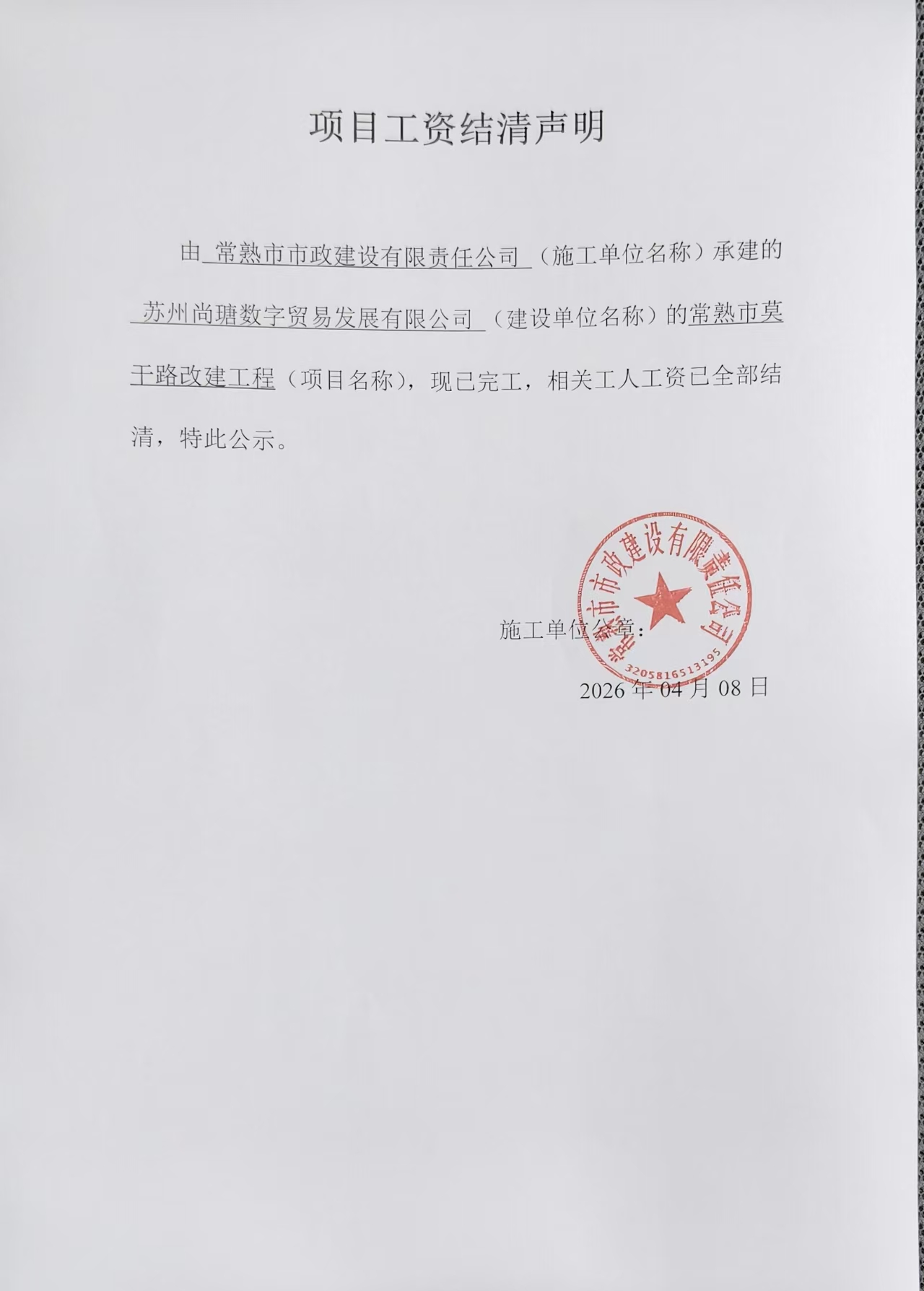 常熟市市政建设有限责任公司常熟市莫干路改建工程