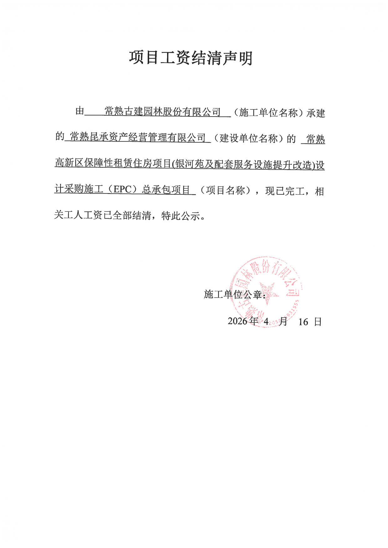 江苏常房建设工程有限公司常熟市2020B-016地块住宅用房项目室外配套工程一期