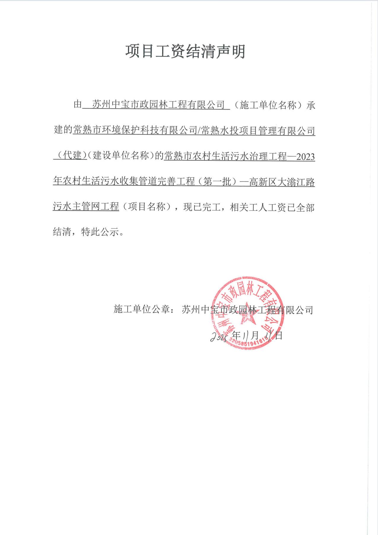 苏州中宝市政园林工程有限公司常熟市农村生活污水治理工程—2023年农村生活污水收集管道完善工程(第一批)—高新区大滃江路污水主管网工程