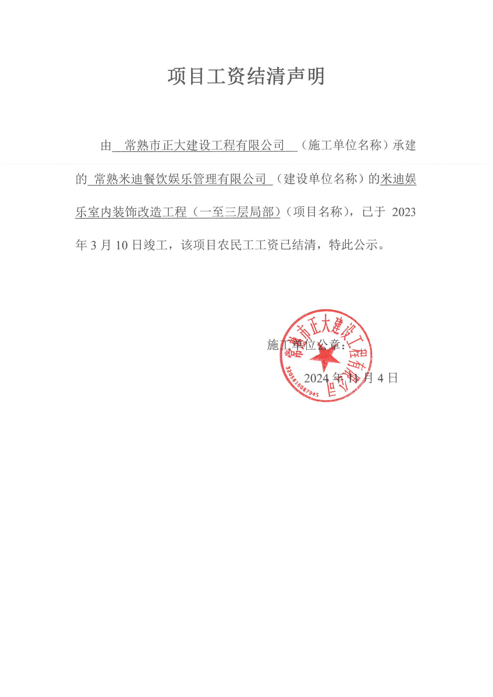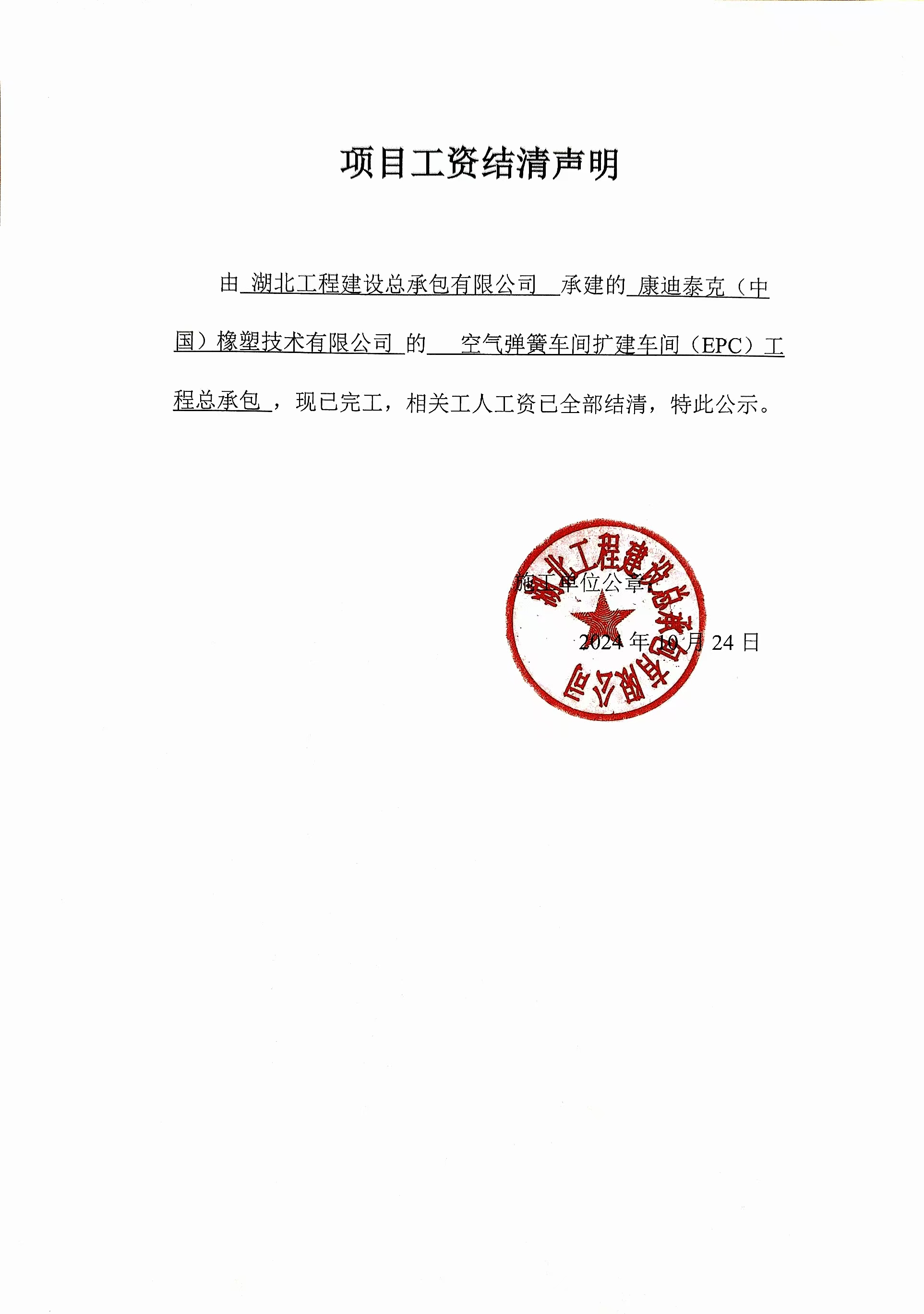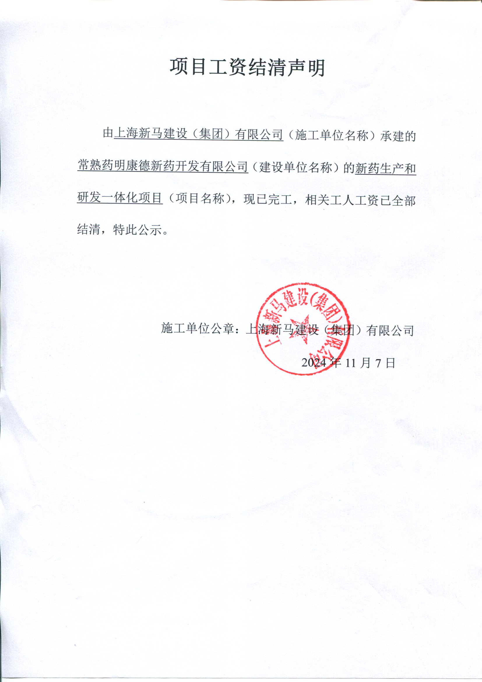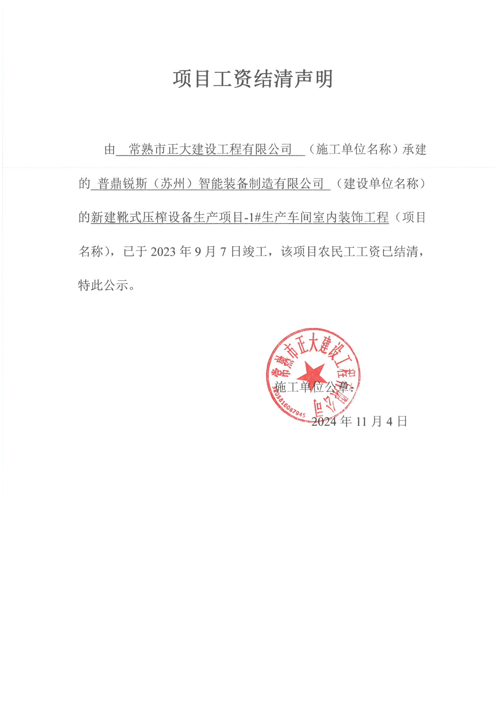 项目工资结清支付公示