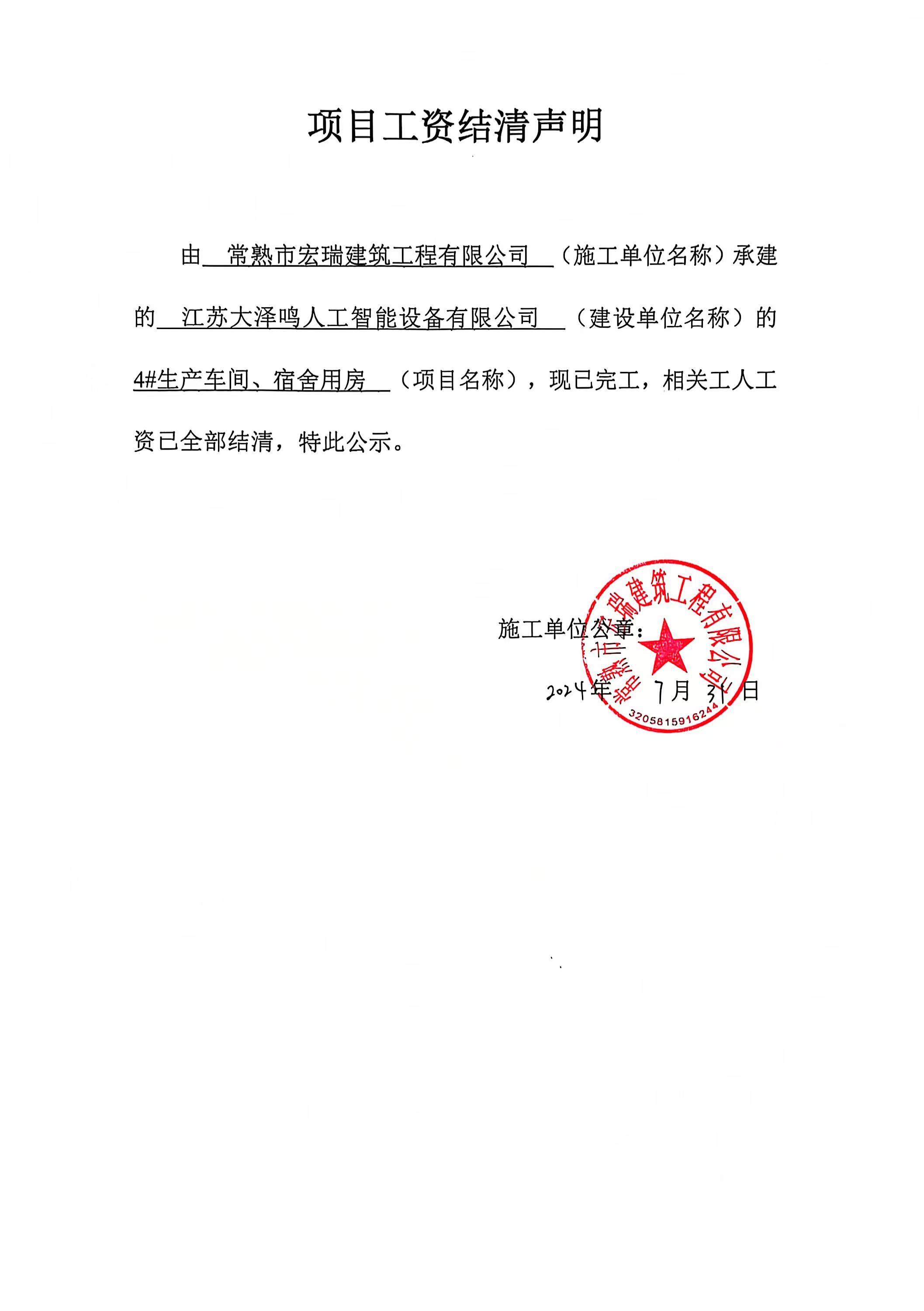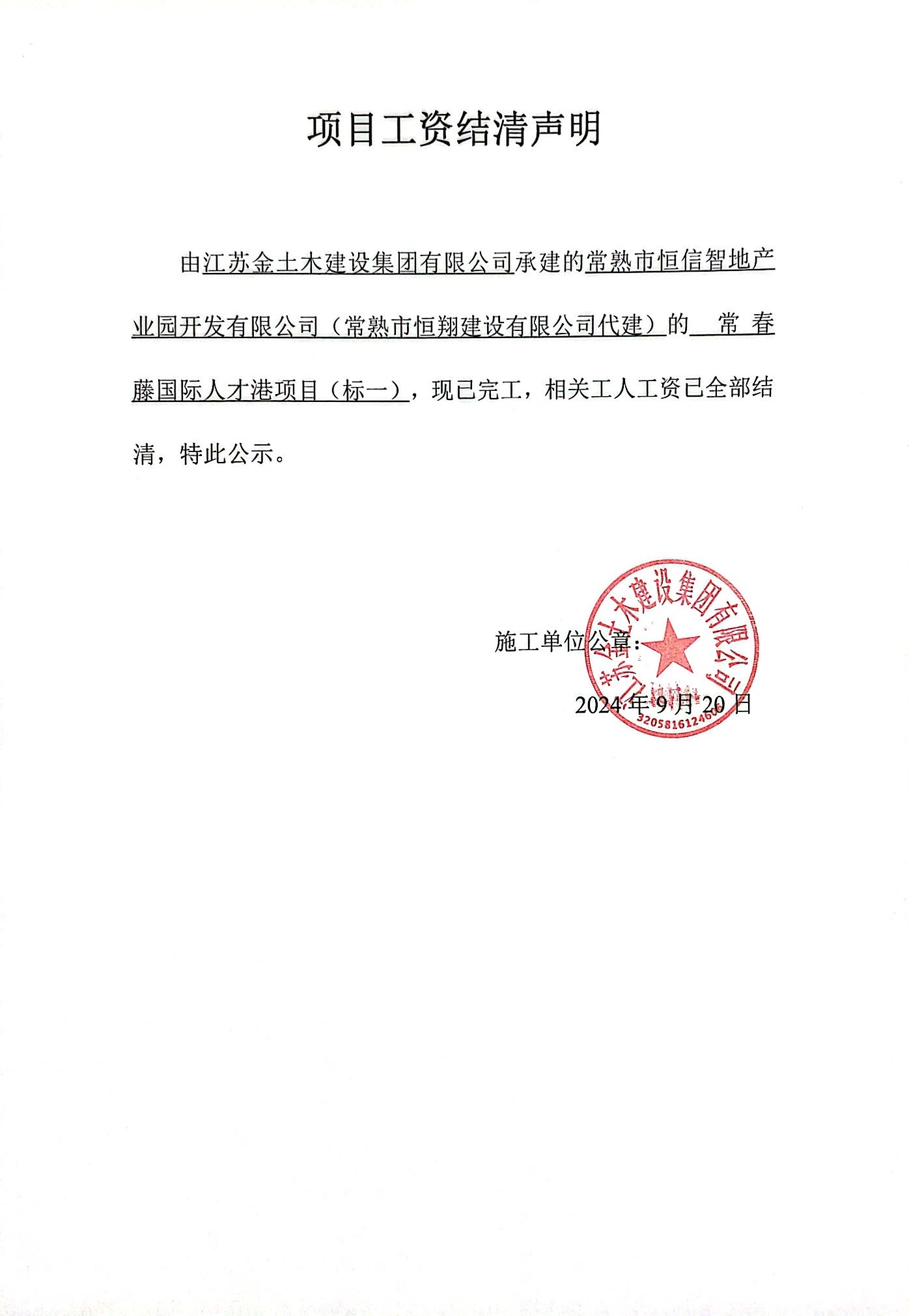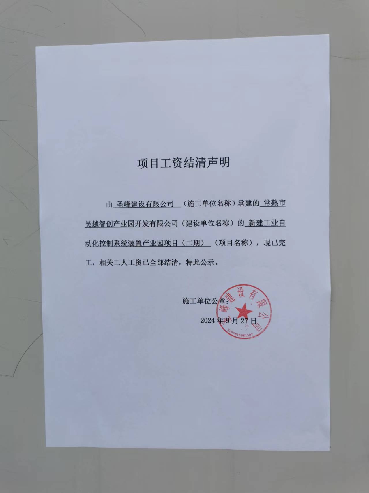 项目工资结清支付公示