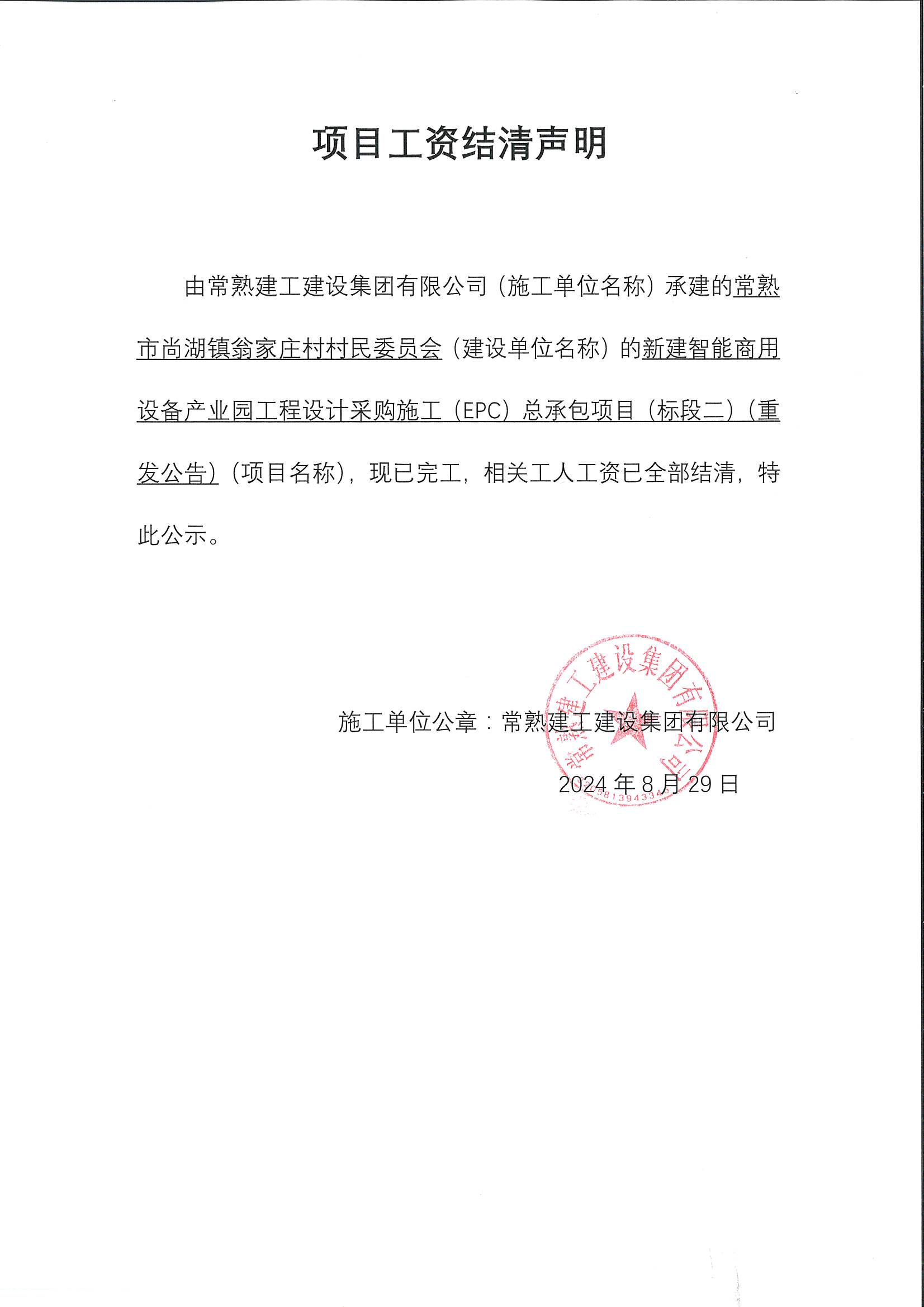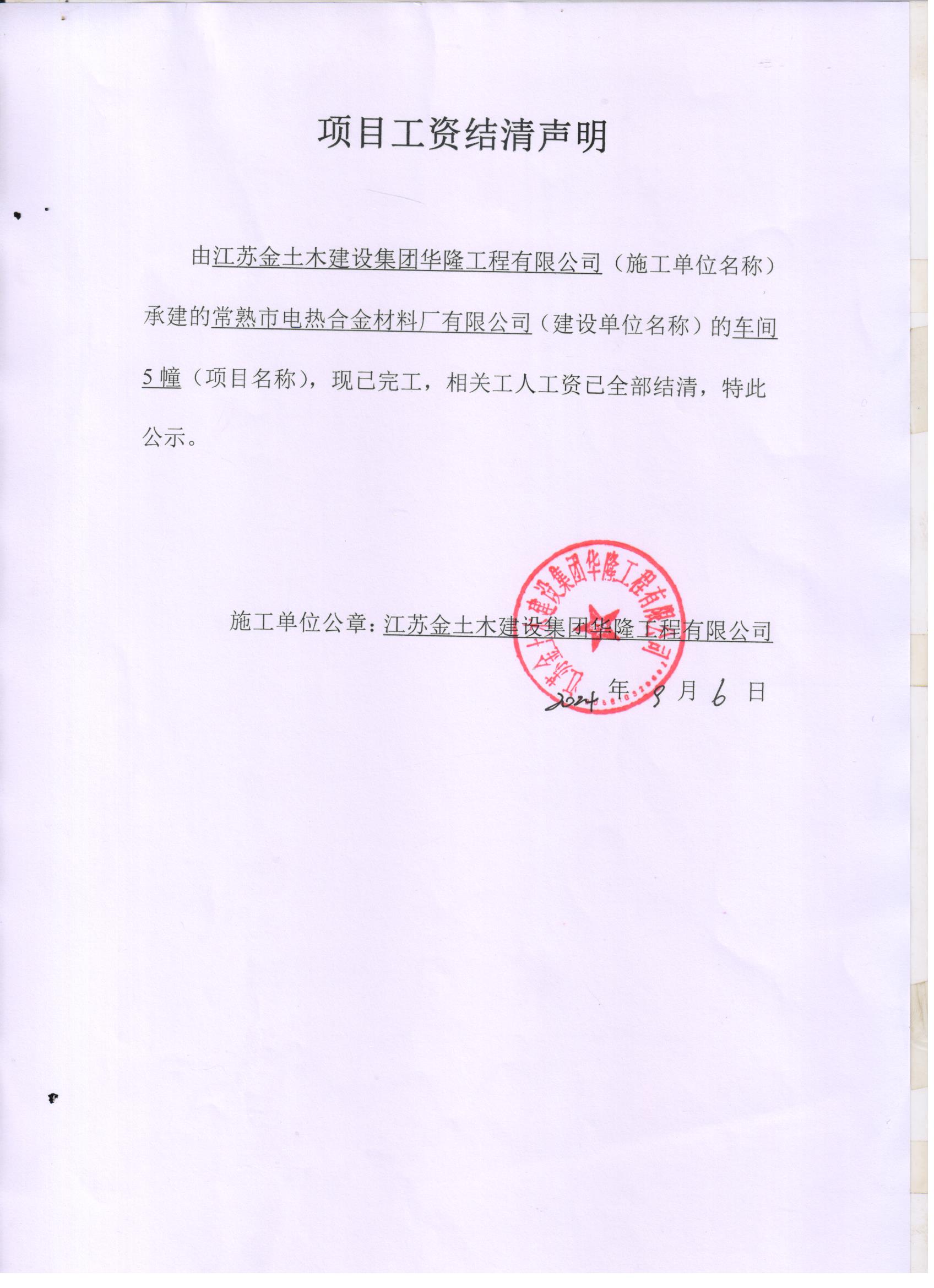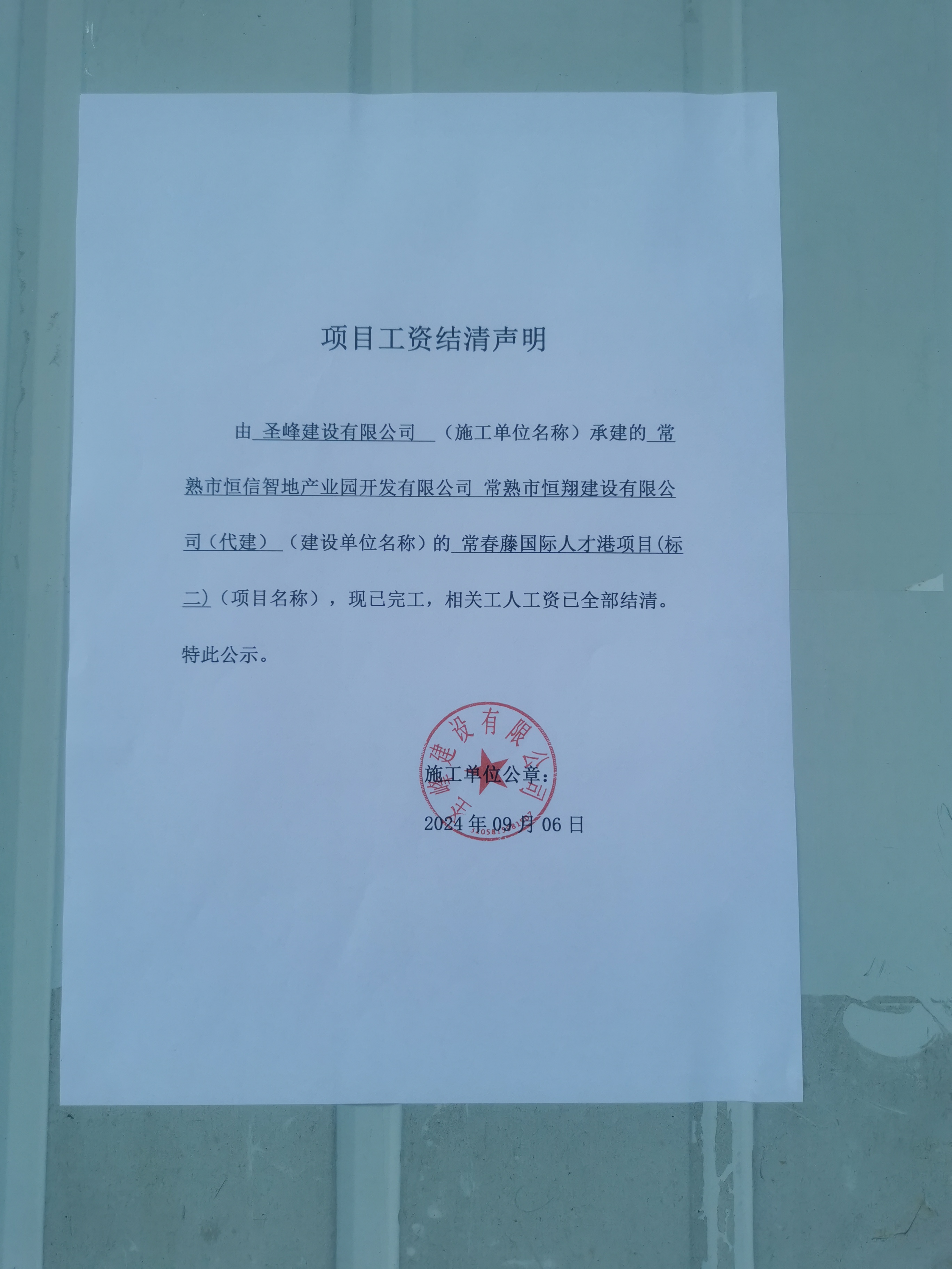 项目工资结清支付公示