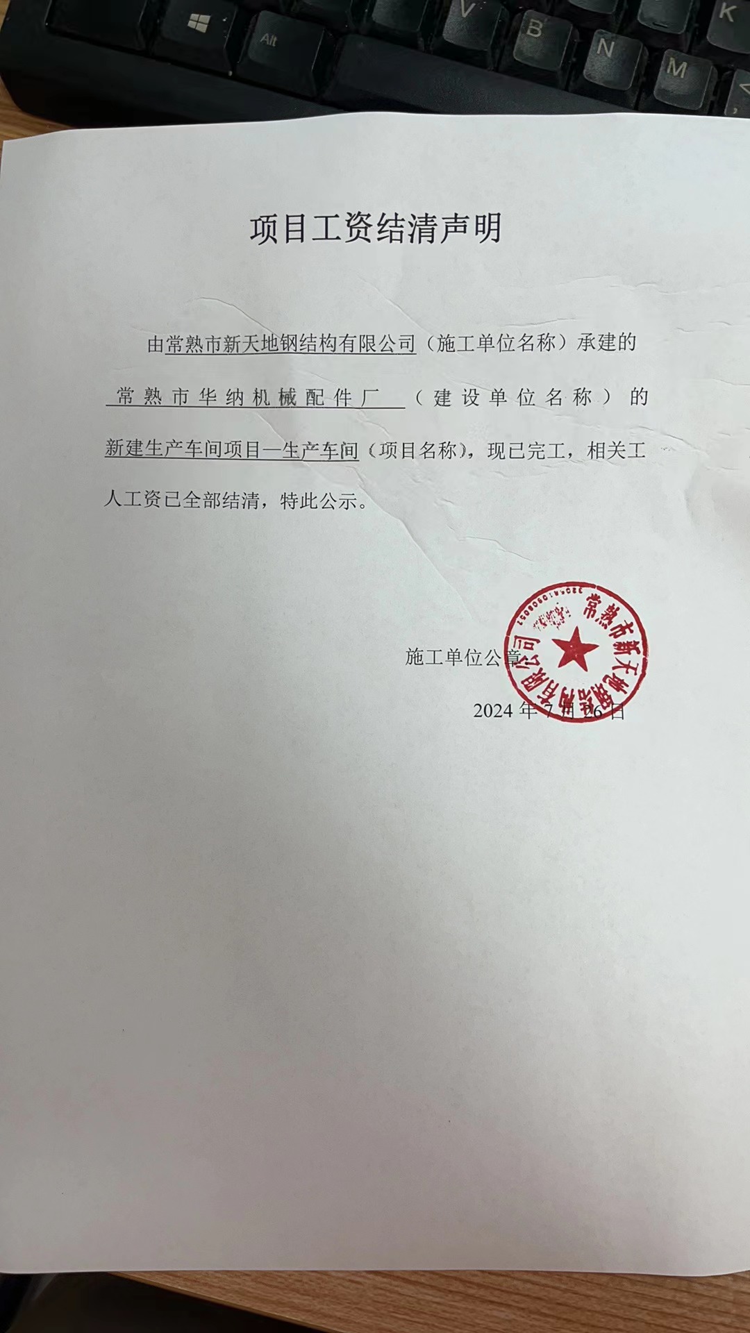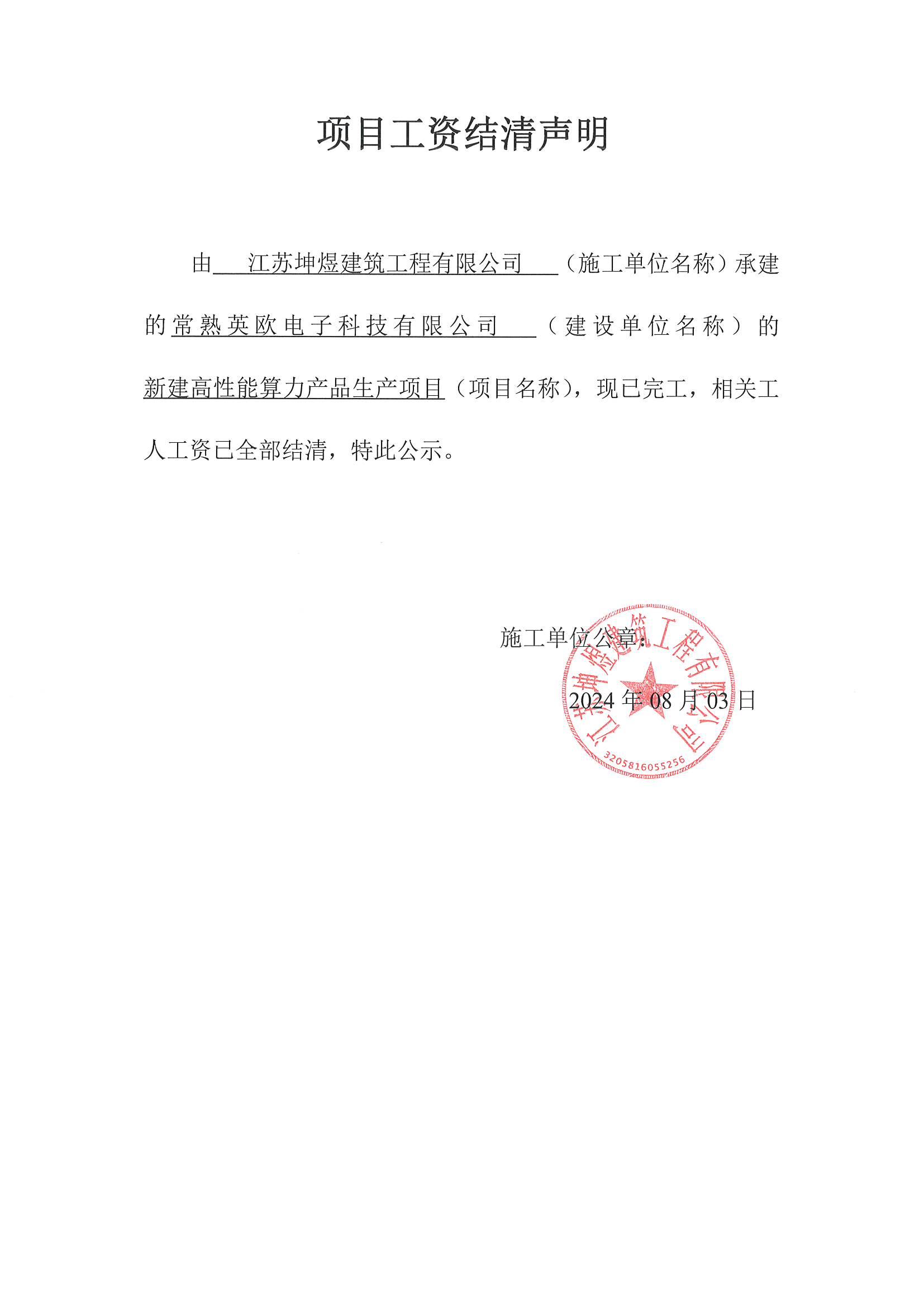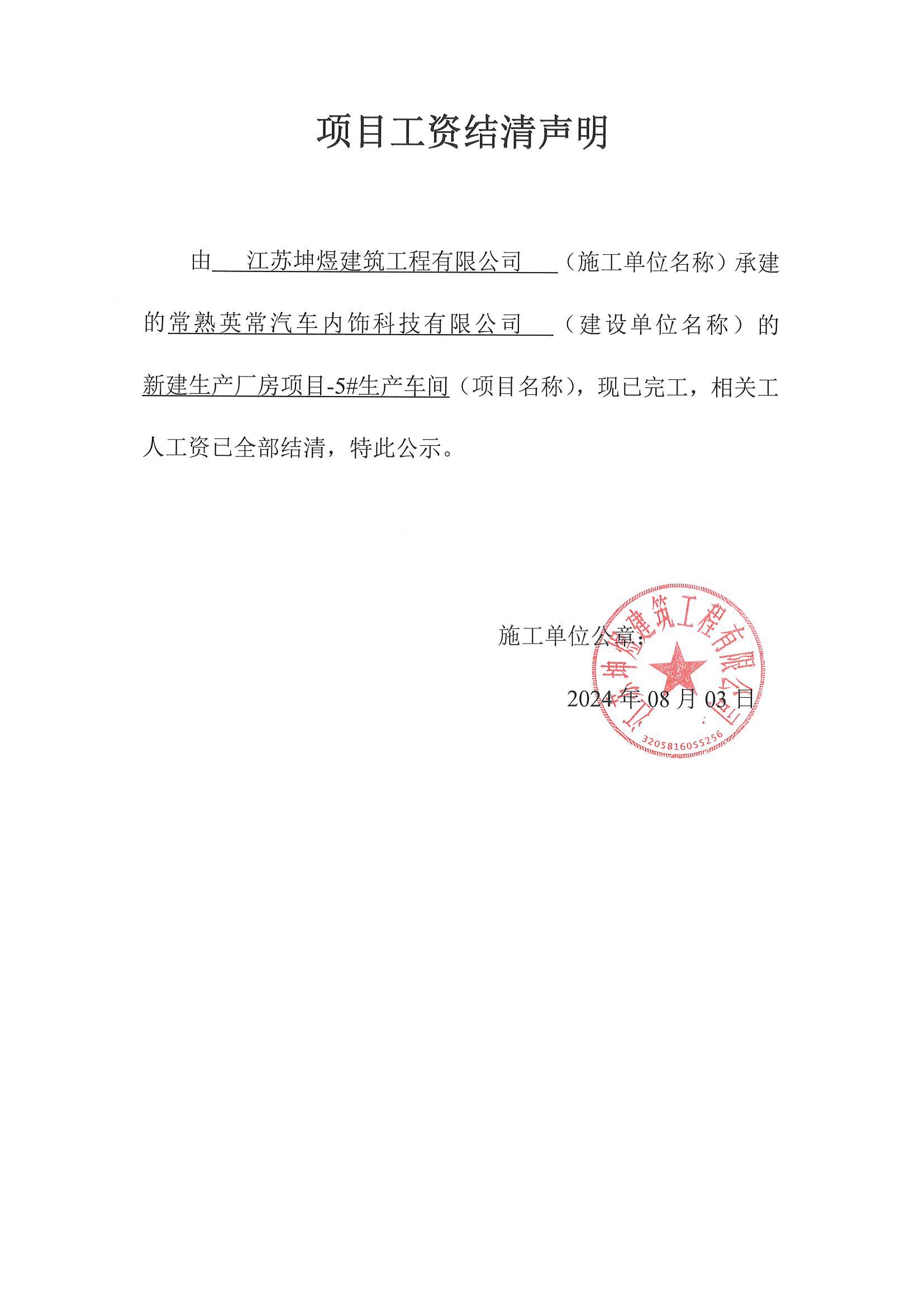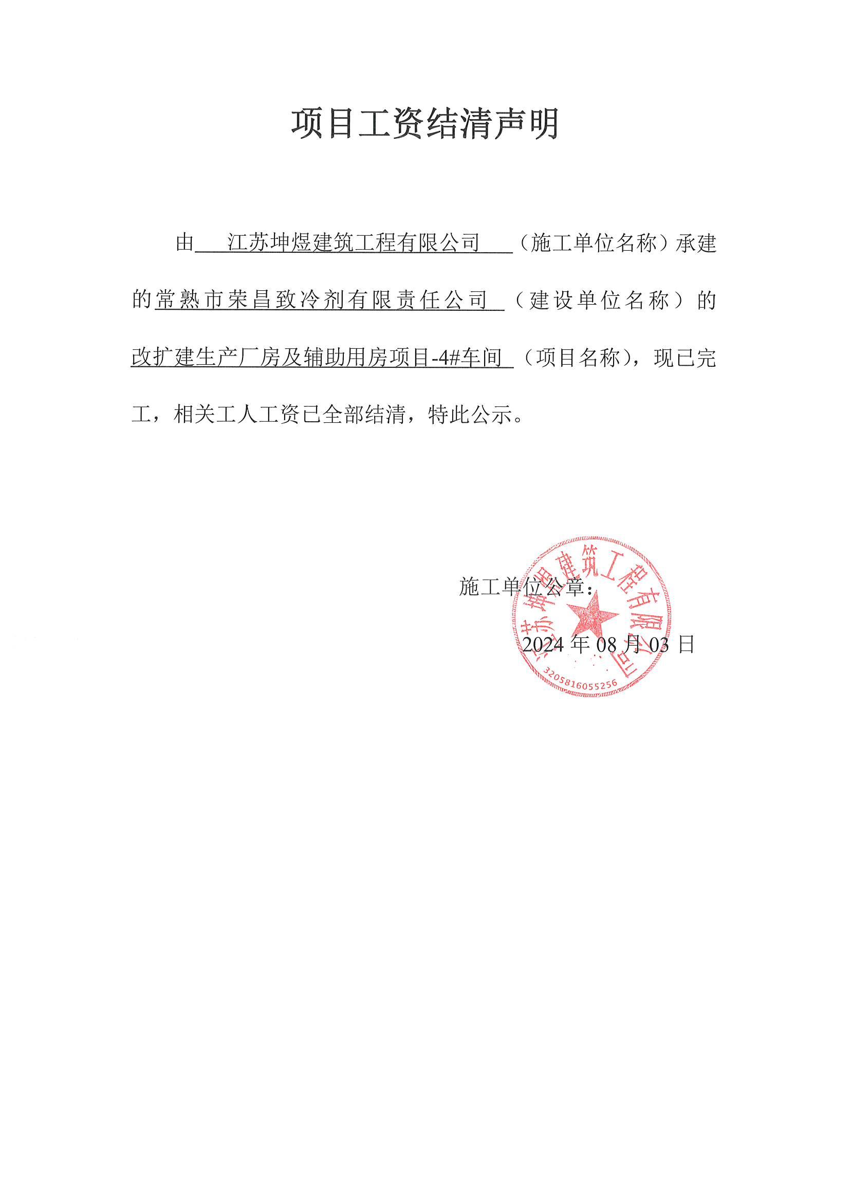 项目工资结清支付公示