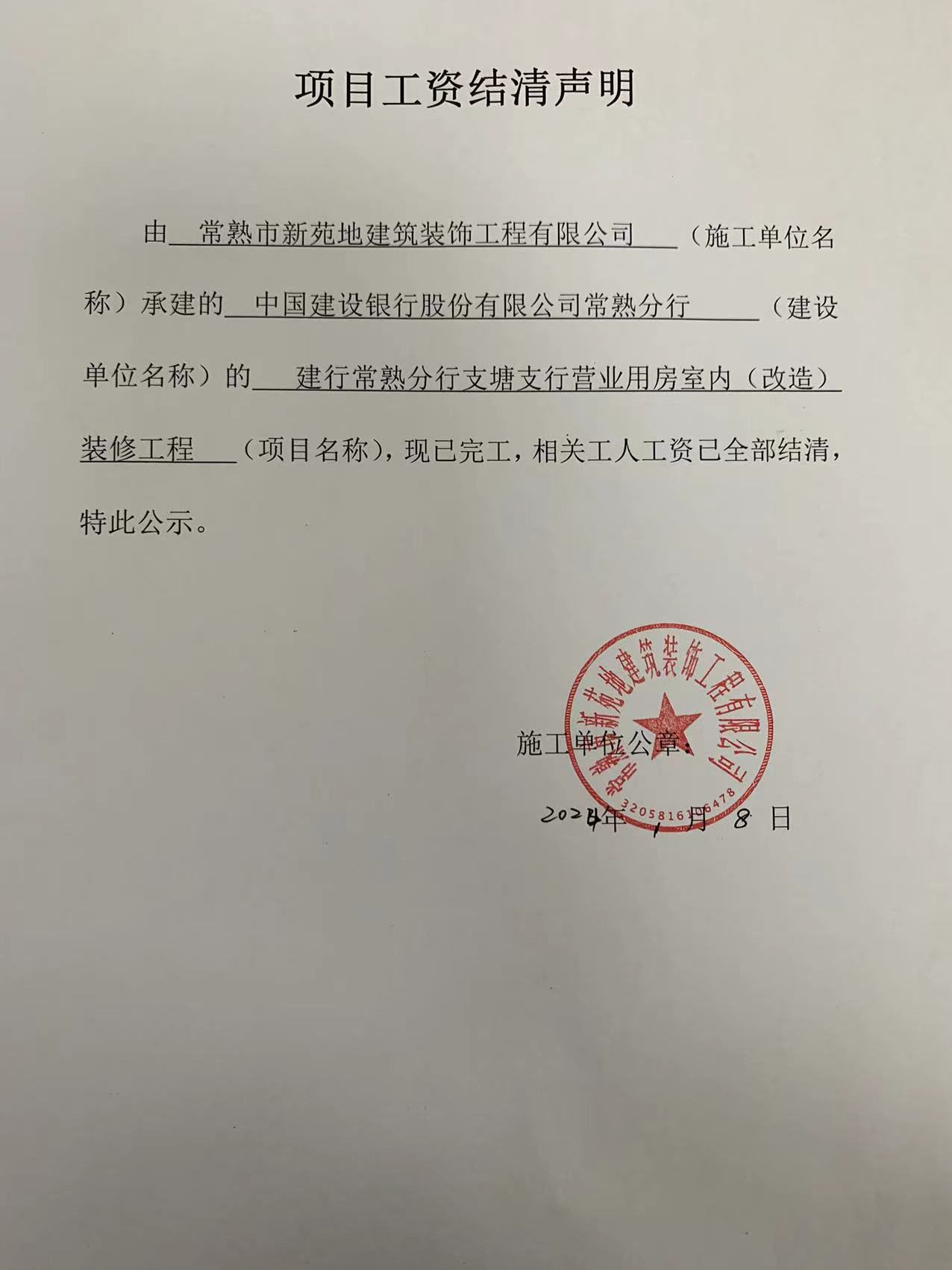 建行常熟分行支塘支行营业用房室内(改造)装修工程
