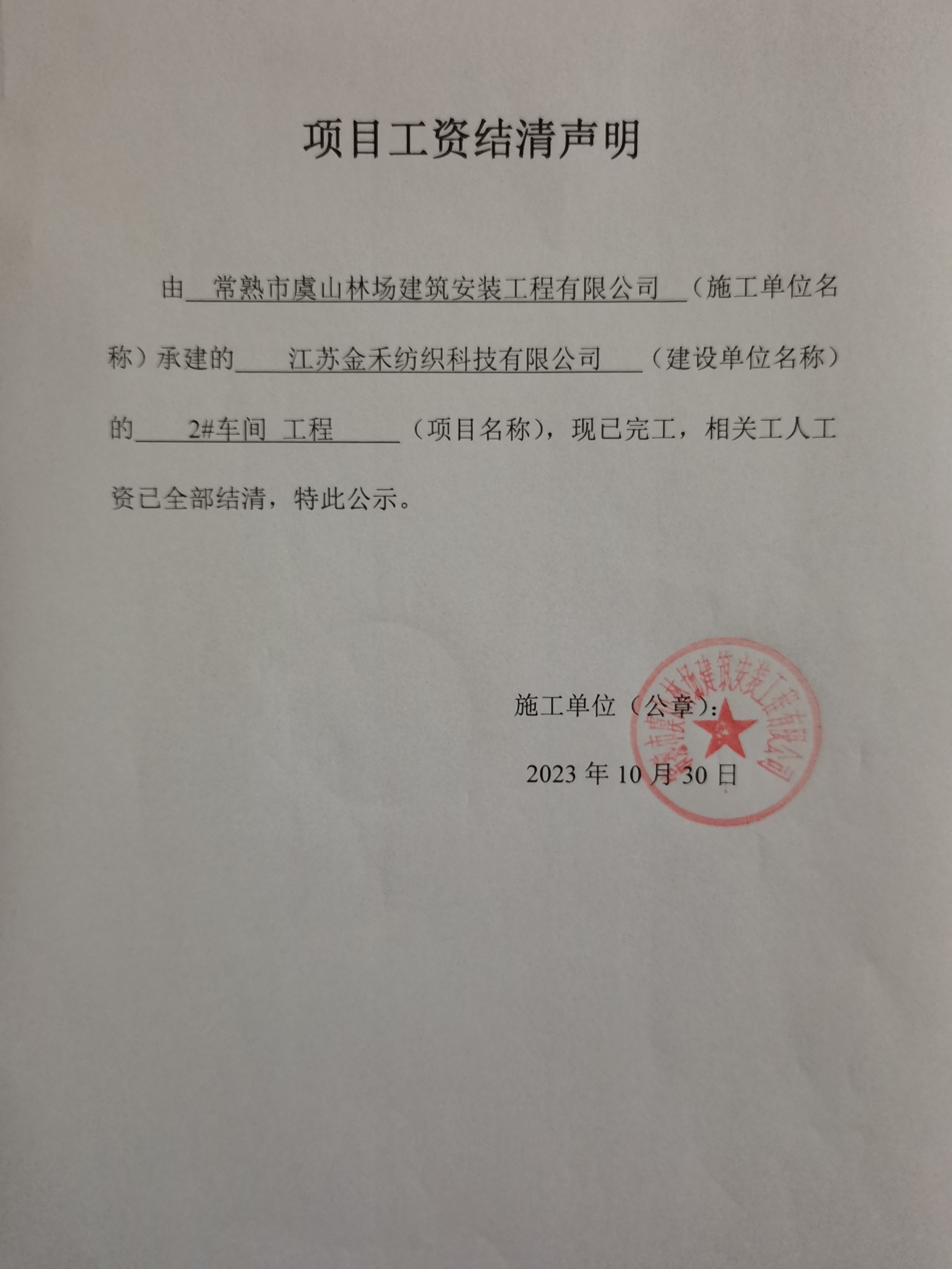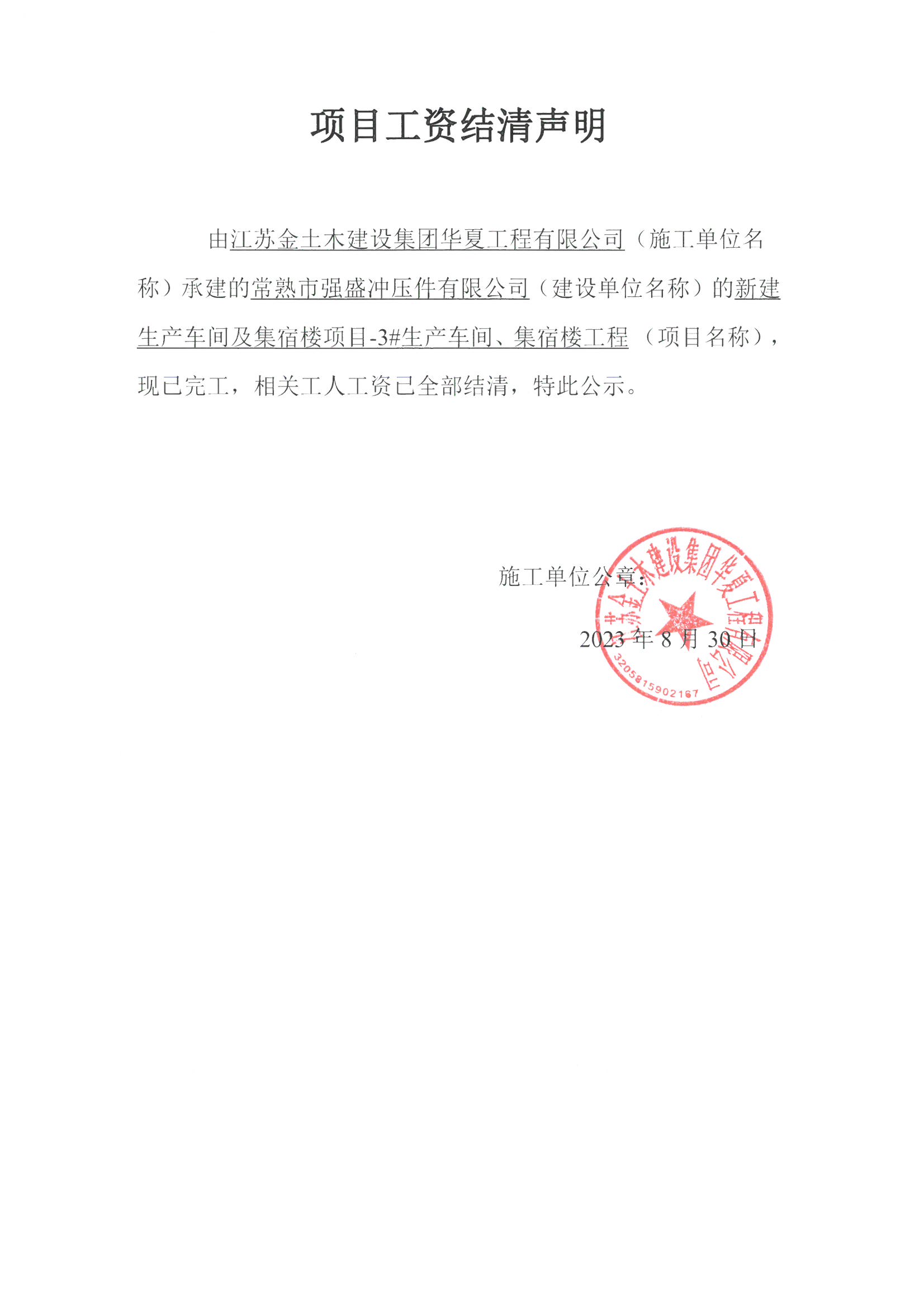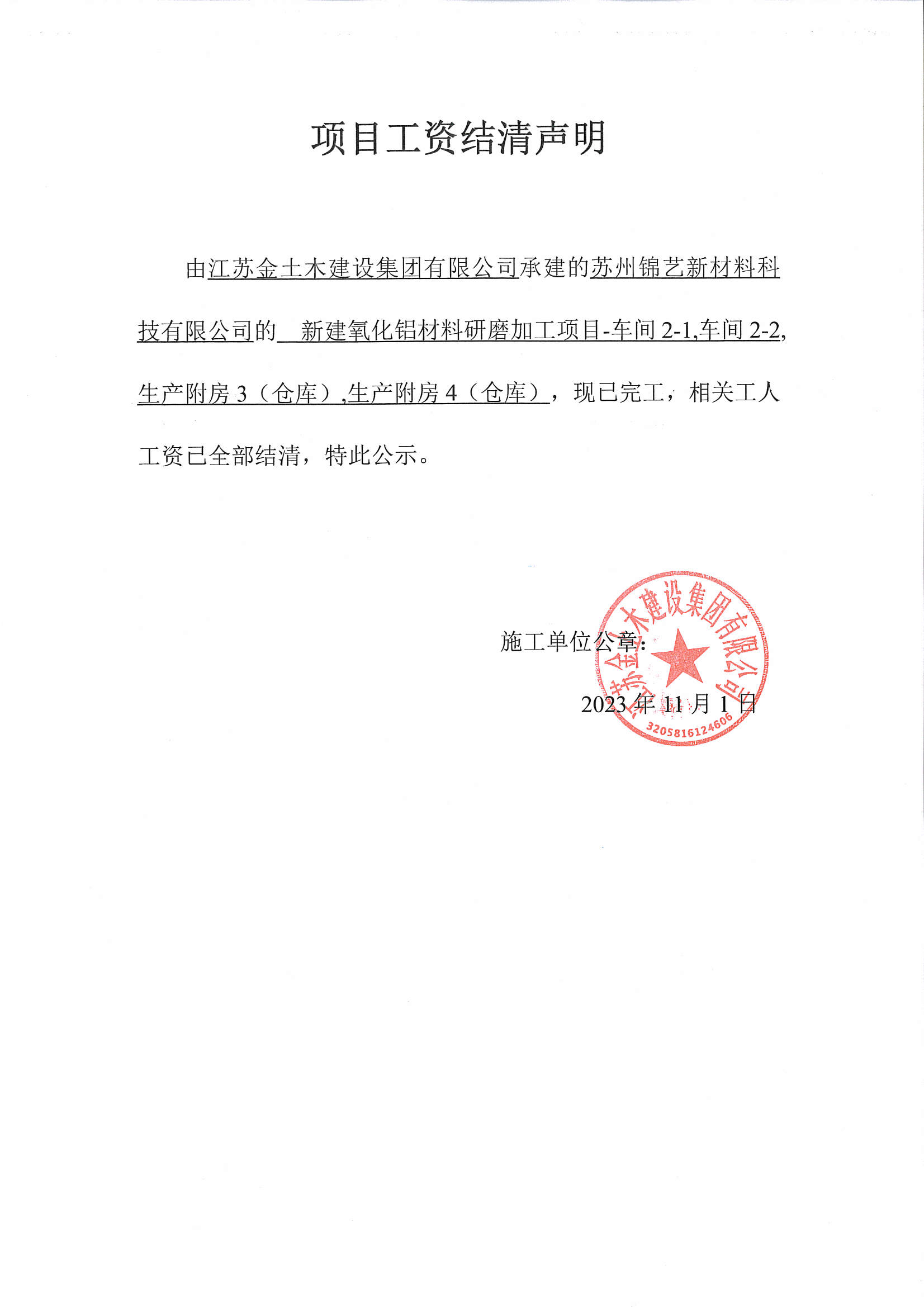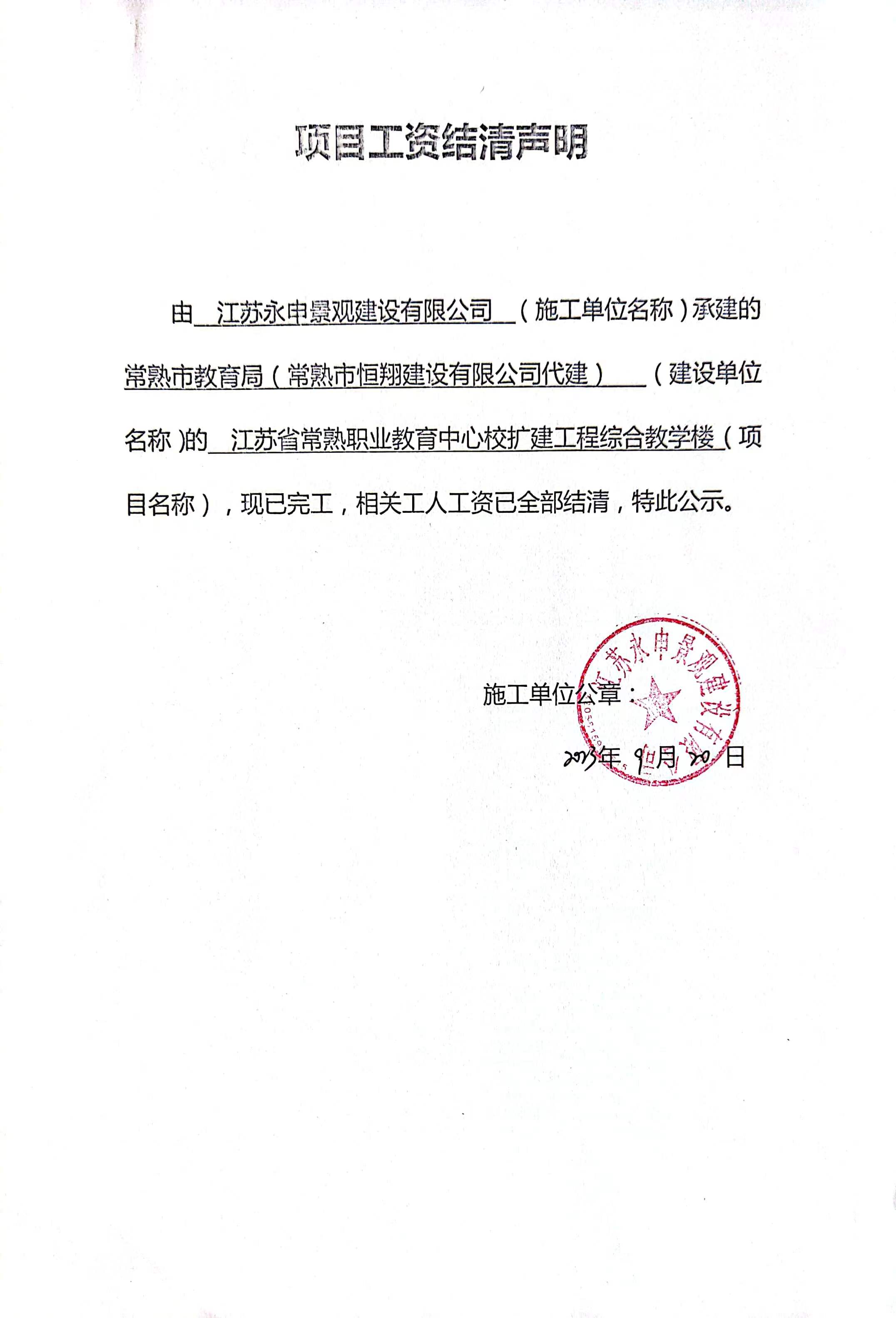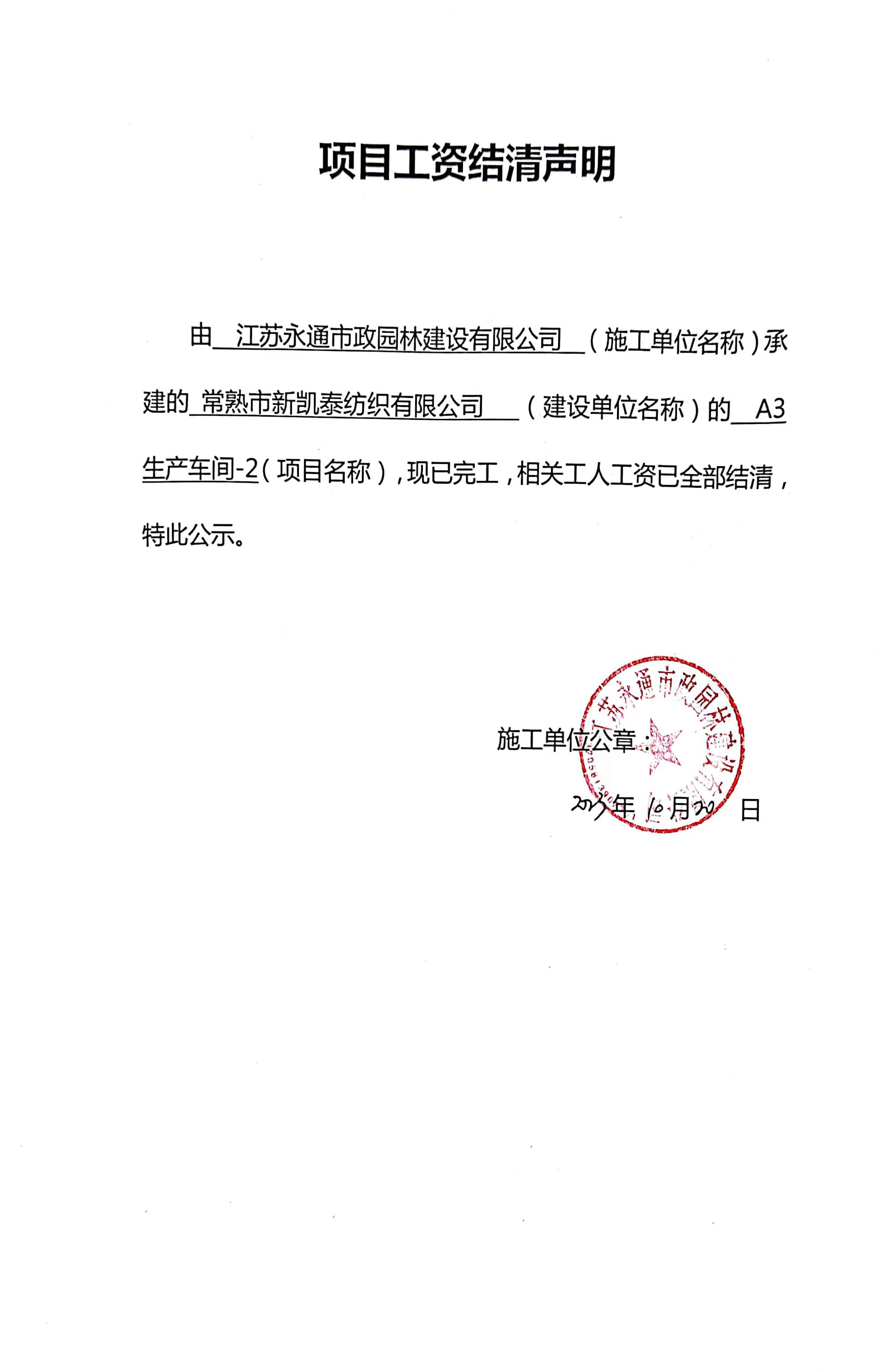 项目工资结清支付公示