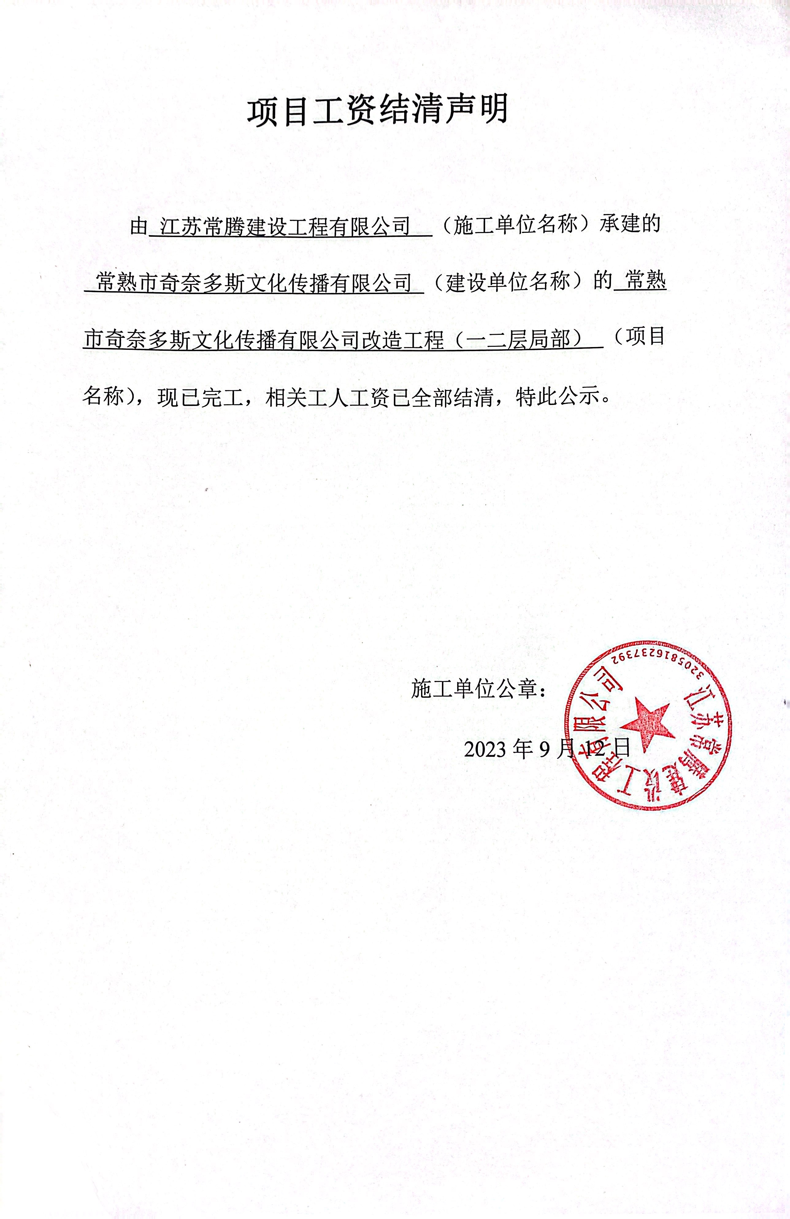 江苏常腾建设工程有限公司 常熟市奇奈多斯文化传播有限公司 常熟市奇奈多斯文化传播有限公司改造工程(一二层局部) 2023-09-12