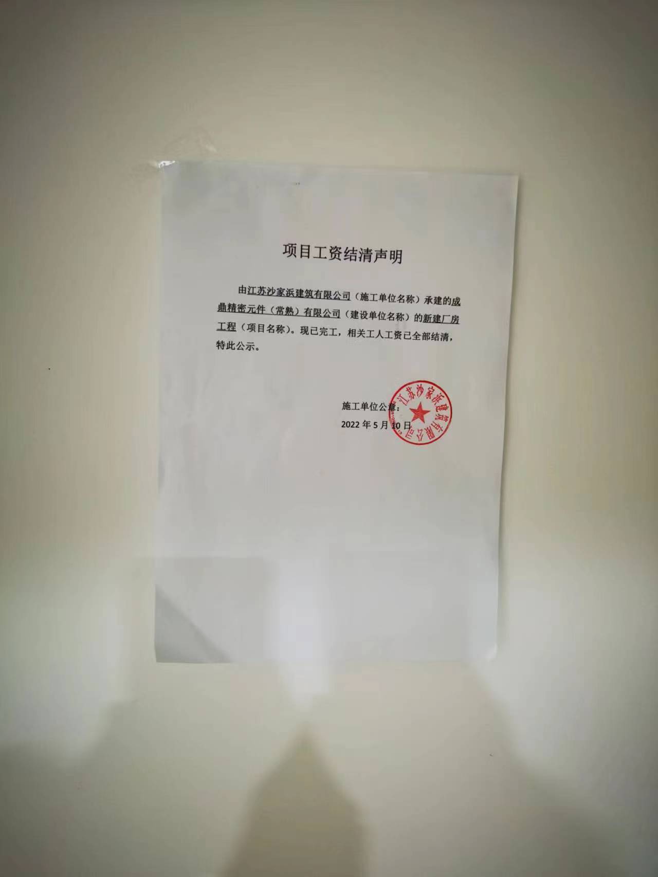 项目工资结清支付公示