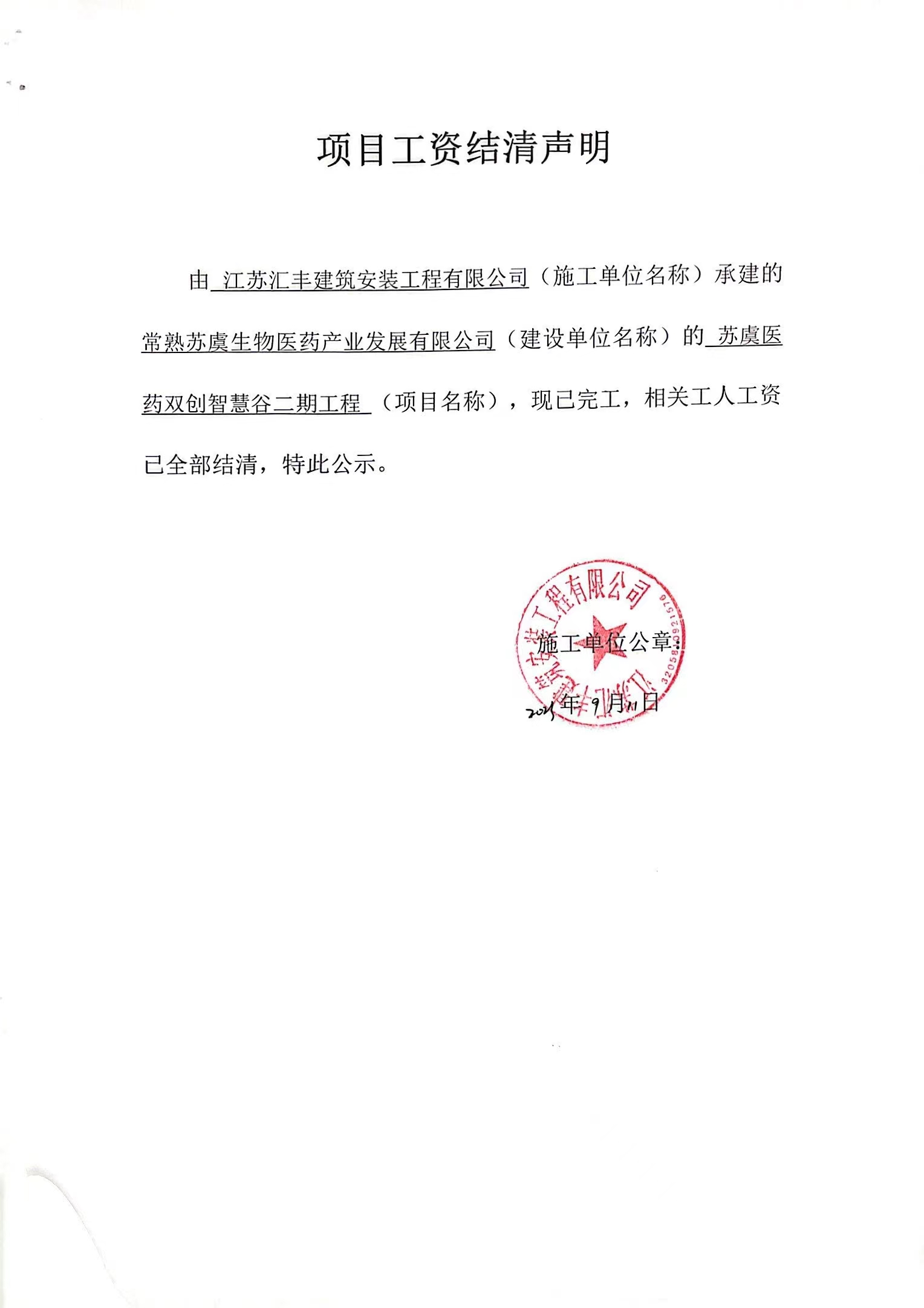 江苏汇丰建筑安装工程有限公司 常熟苏虞生物医药产业发展有限公司 苏虞医药双创智慧谷二期工程 2023-09-12