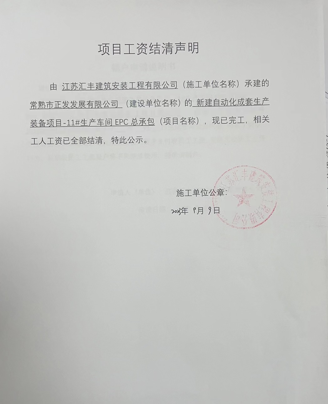 江苏汇丰建筑安装工程有限公司 常熟市正发发展有限公司 新建自动化成套生产装备项目-11#生产车间EPC总承包 2023-09-12
