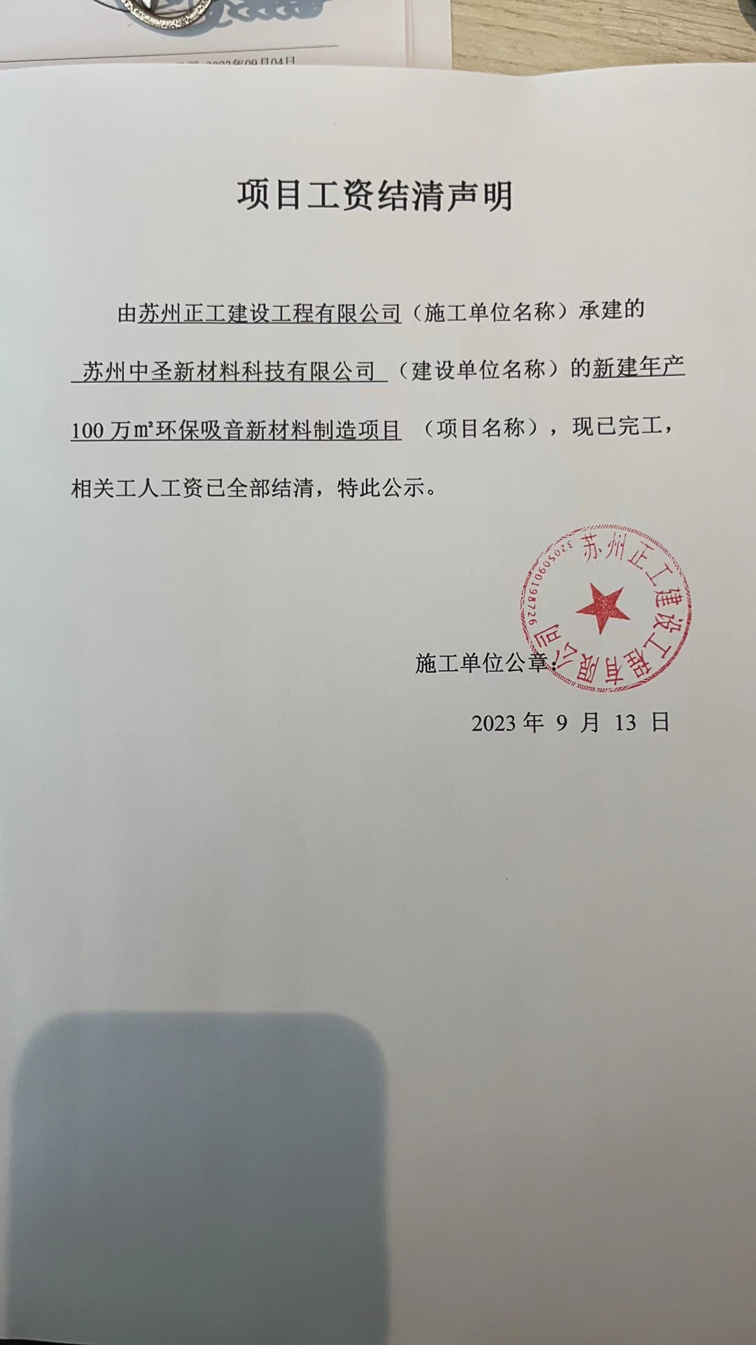 苏州正工建设工程有限公司 苏州中圣新材料科技有限公司 新建年产100万㎡环保吸音新材料制造项目 2023-09-13