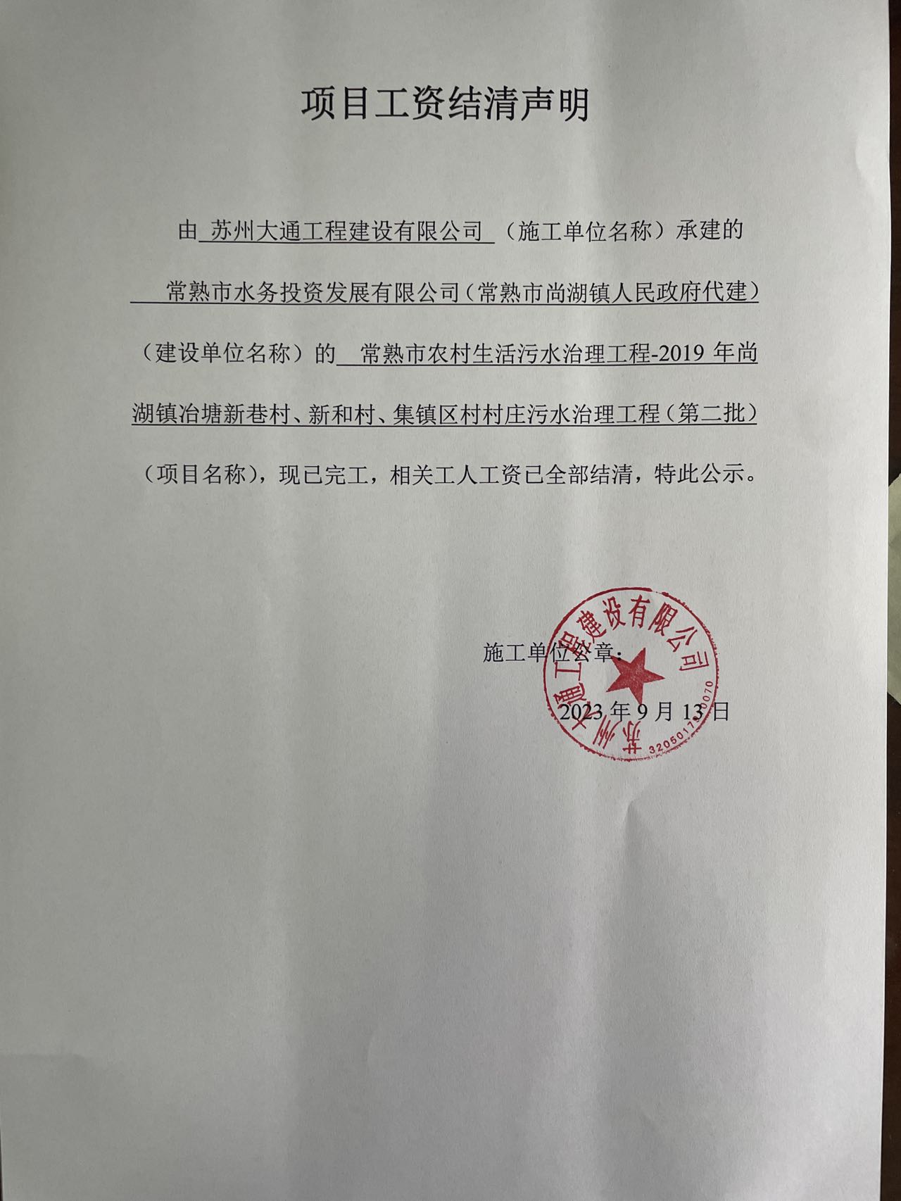 苏州大通工程建设有限公司 常熟市水务投资发展有限公司(常熟市尚湖镇人民政府代建) 常熟市农村生活污水治理工程-2019年尚湖镇冶塘新巷村、新和村、集镇区村村庄污水治理工程(第二批) 2023-09-13