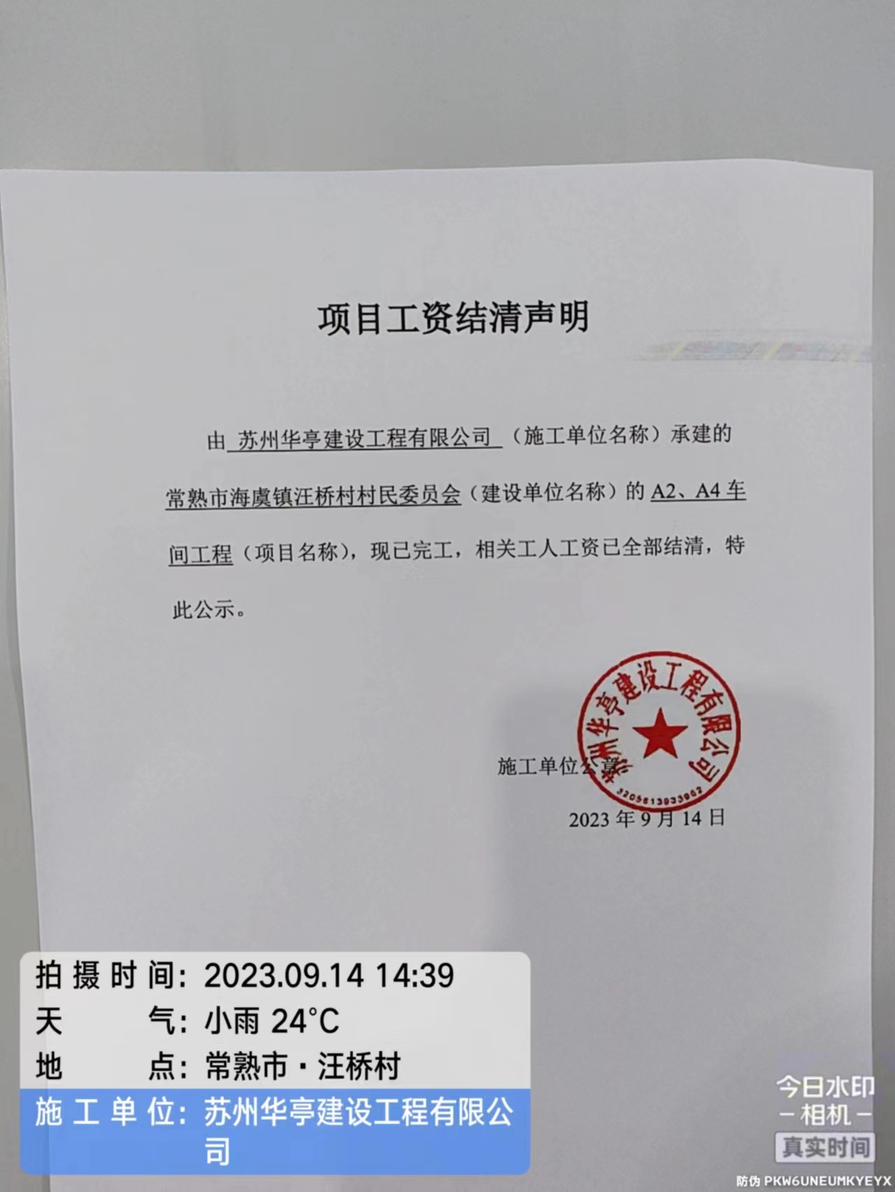 苏州华亭建设工程有限公司 常熟市海虞镇汪桥村村民委员会 A2、A4车间工程 2023-09-14