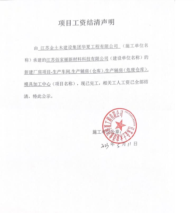 江苏金土木建设集团华夏工程有限公司 江苏佰家丽新材料科技有限公司 新建厂房项目-生产车间2、生产辅房(仓库)、生产辅房(危废仓库)、模具加工中心 2023-09-15