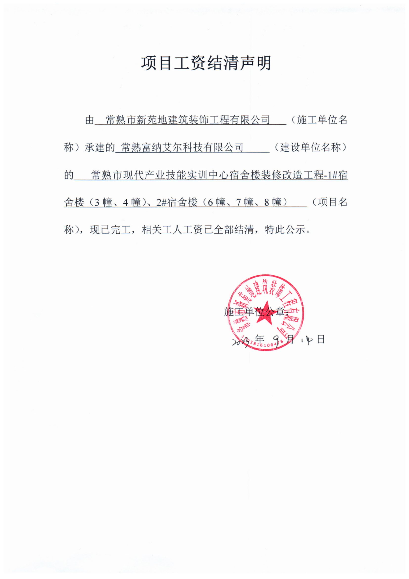 常熟市新苑地建筑装饰工程有限公司 常熟富纳艾尔科技有限公司 常熟市现代产业技能实训中心宿舍楼装修改造工程-1#宿舍楼(3幢、4幢)、2#宿舍楼(6幢、7幢、8幢) 2023-09-14