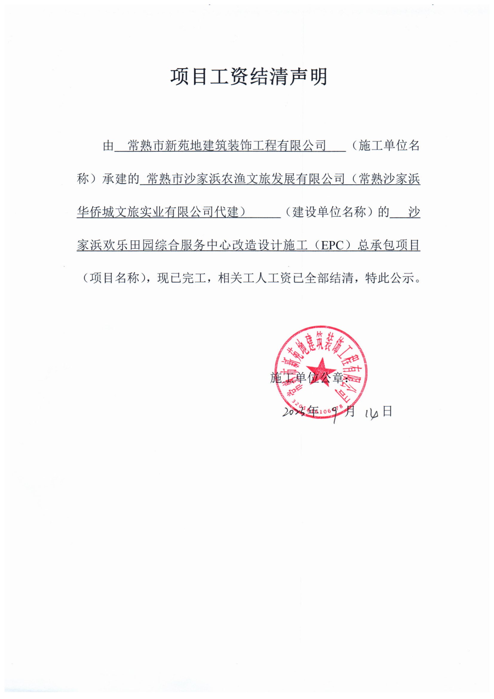 常熟市新苑地建筑装饰工程有限公司 常熟市沙家浜农渔文旅发展有限公司(常熟沙家浜华侨城文旅实业有限公司代建 沙家浜欢乐田园综合服务中心改造设计施工(EPC)总承包项目 2023-09-14
