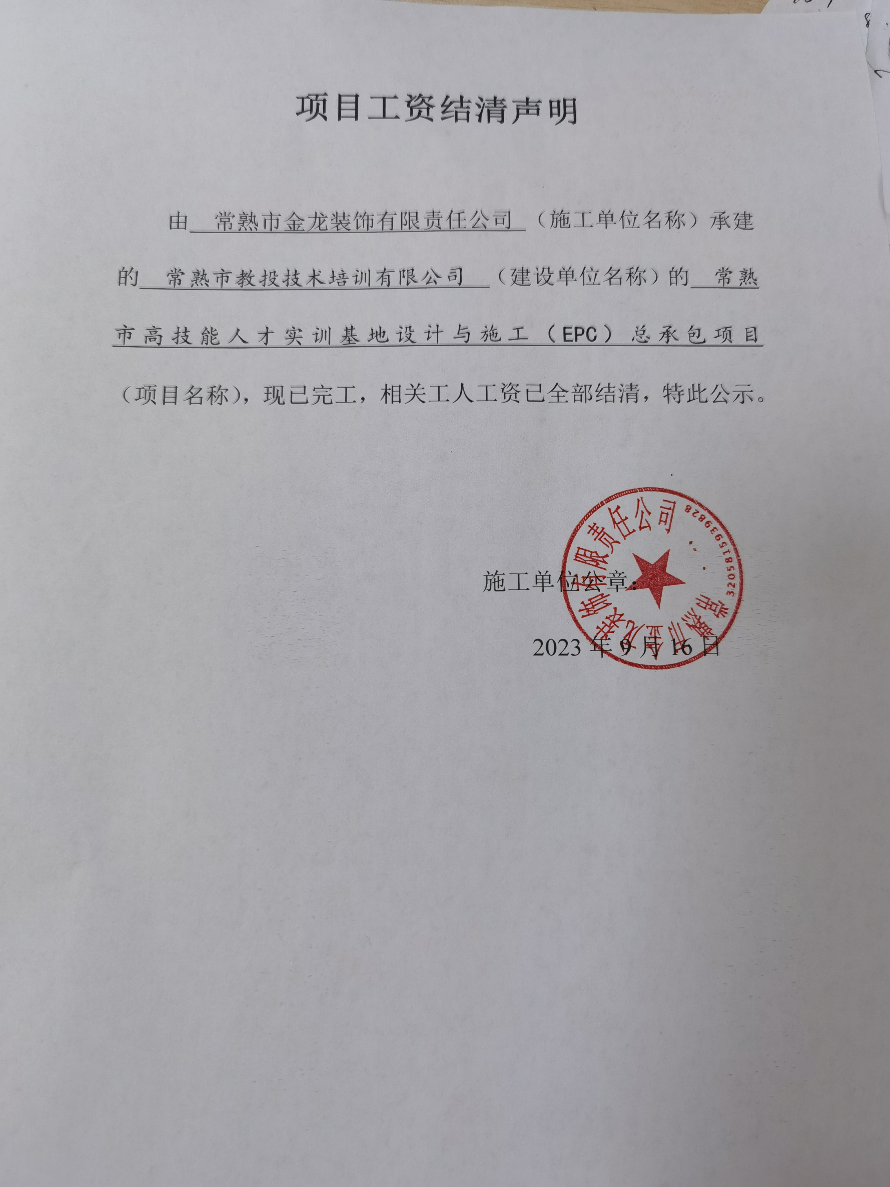 常熟市金龙装饰有限责任公司 常熟市教投技术培训有限公司 常熟市高技能人才实训基地设计与施工(EPC)总承包项目 2023-09-16