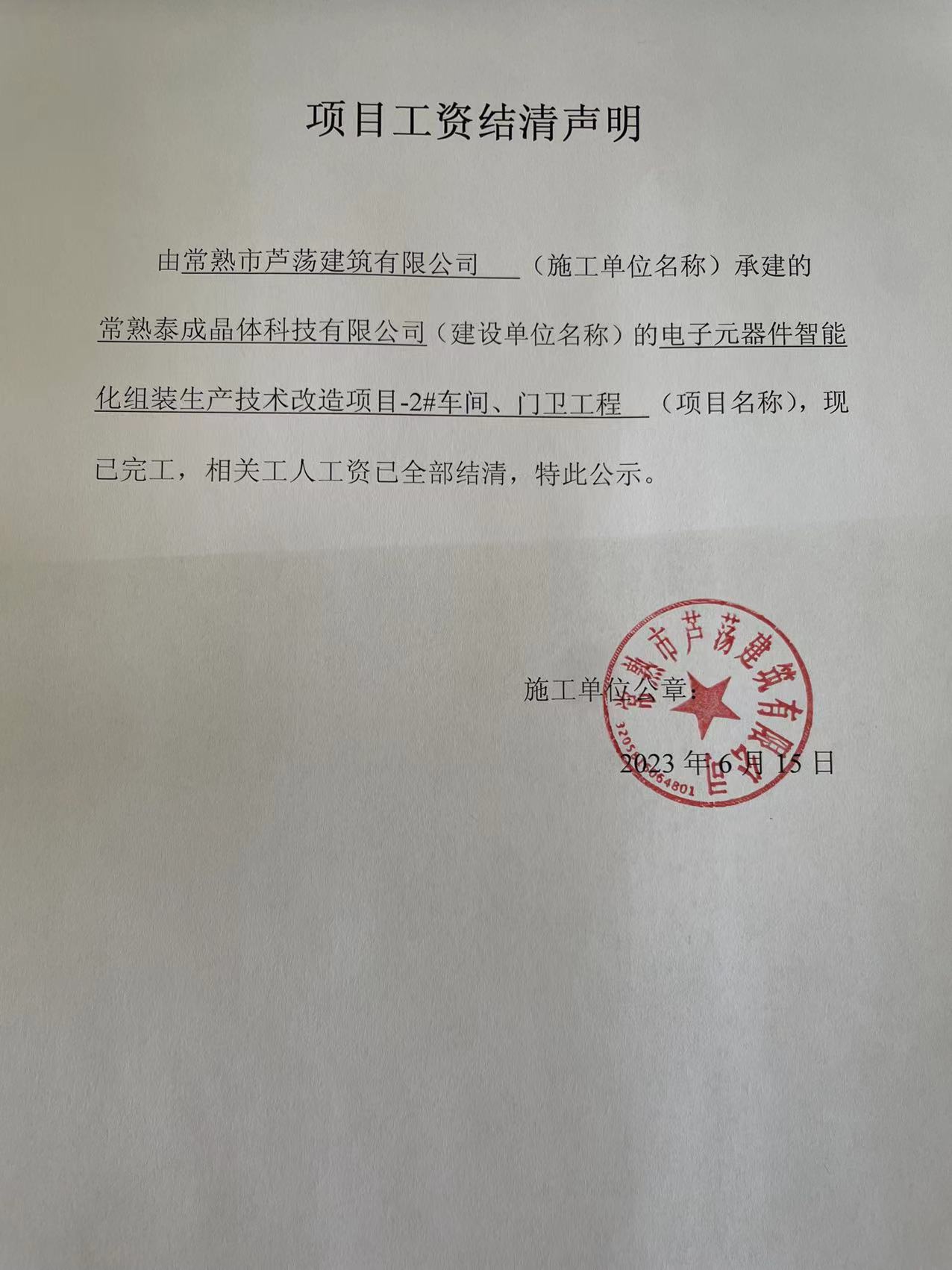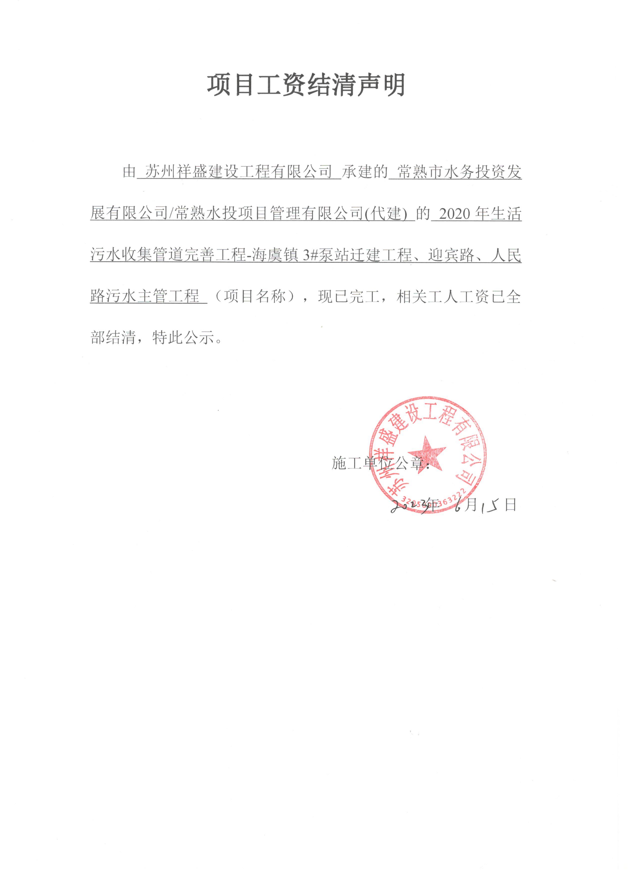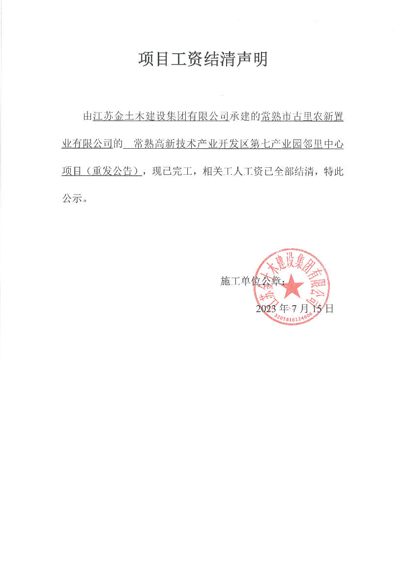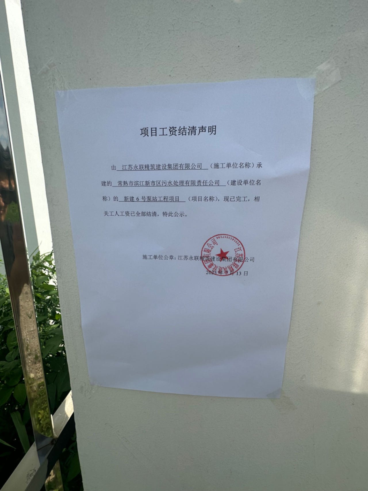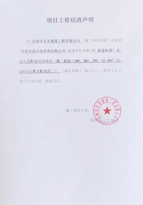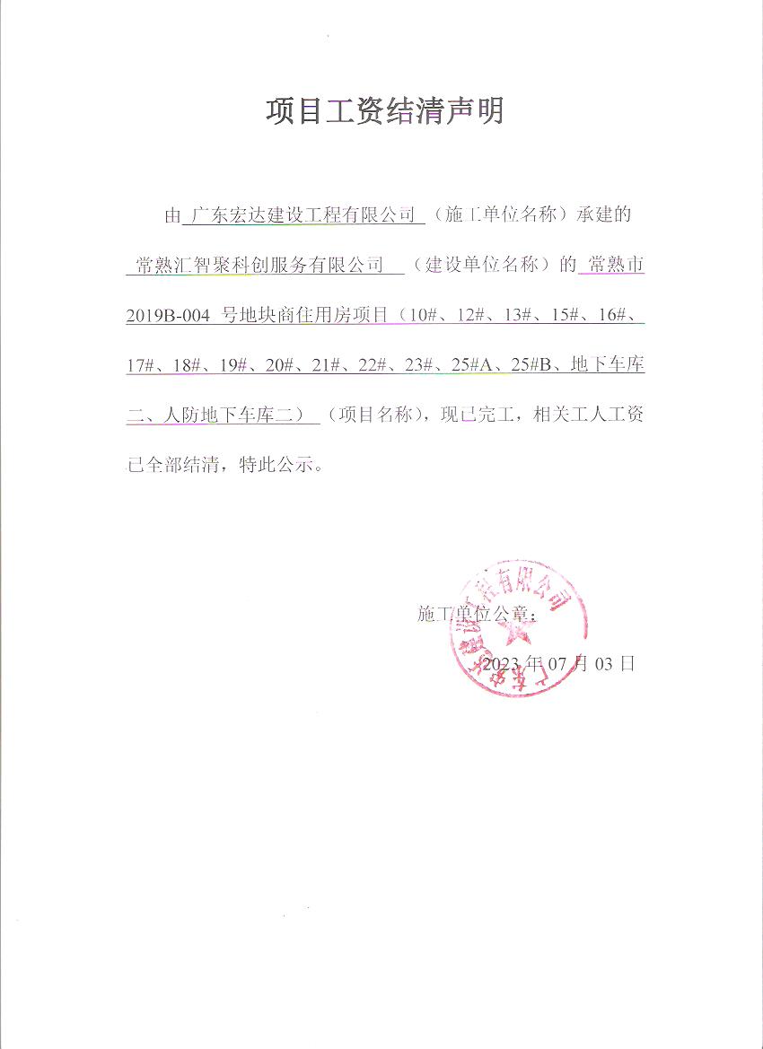 项目工资结清支付公示