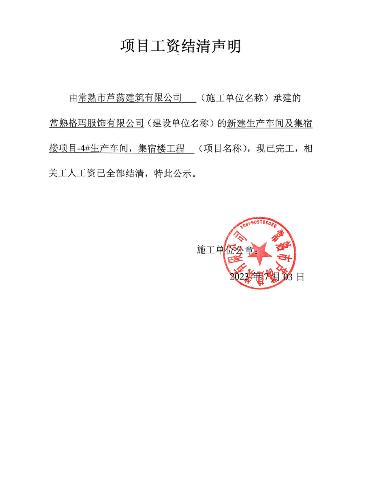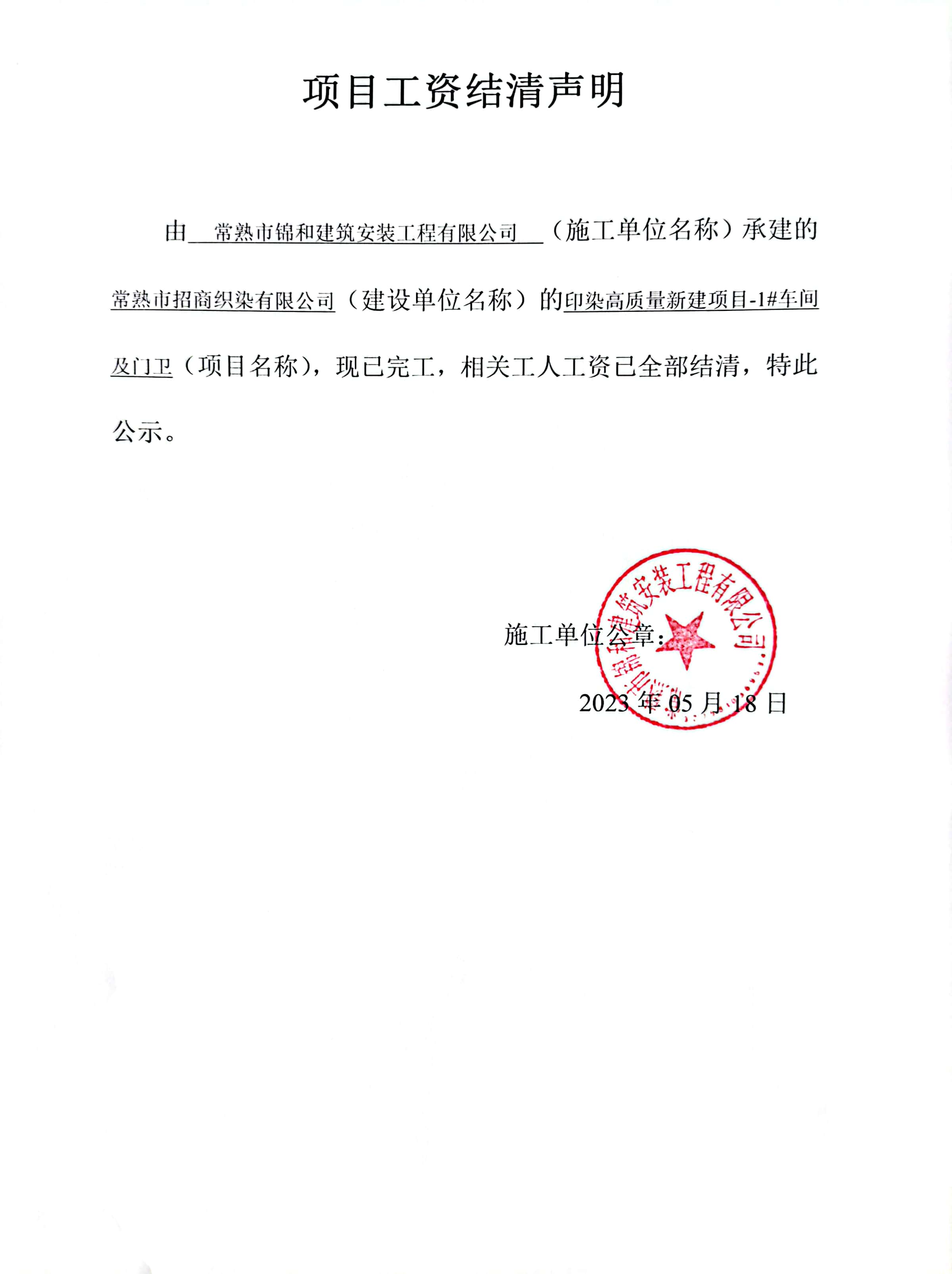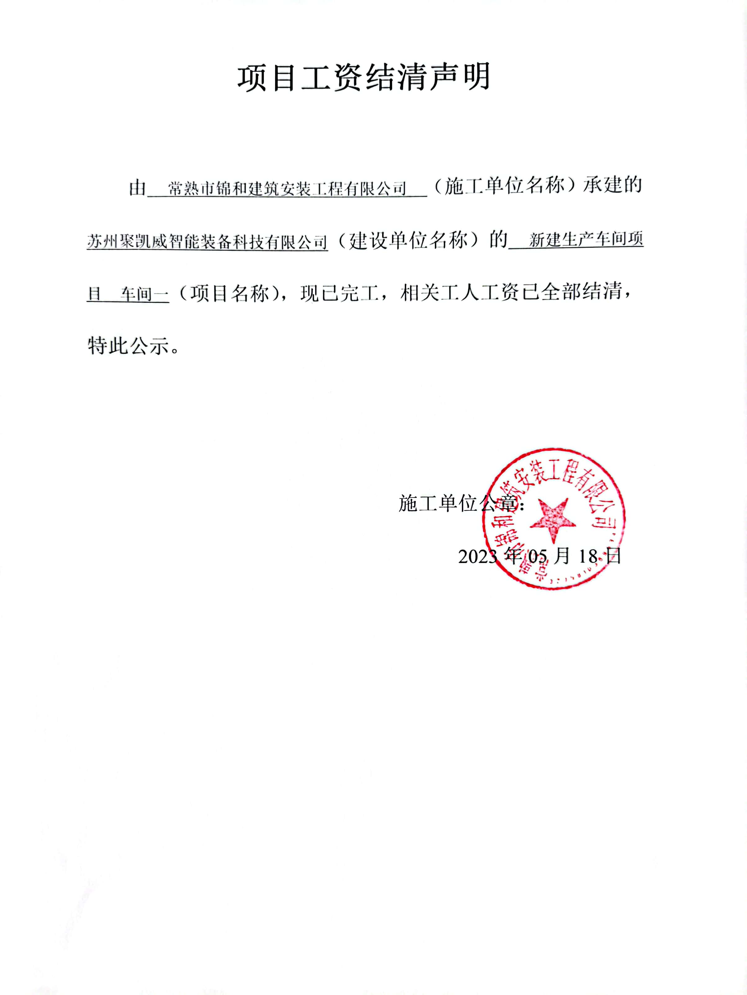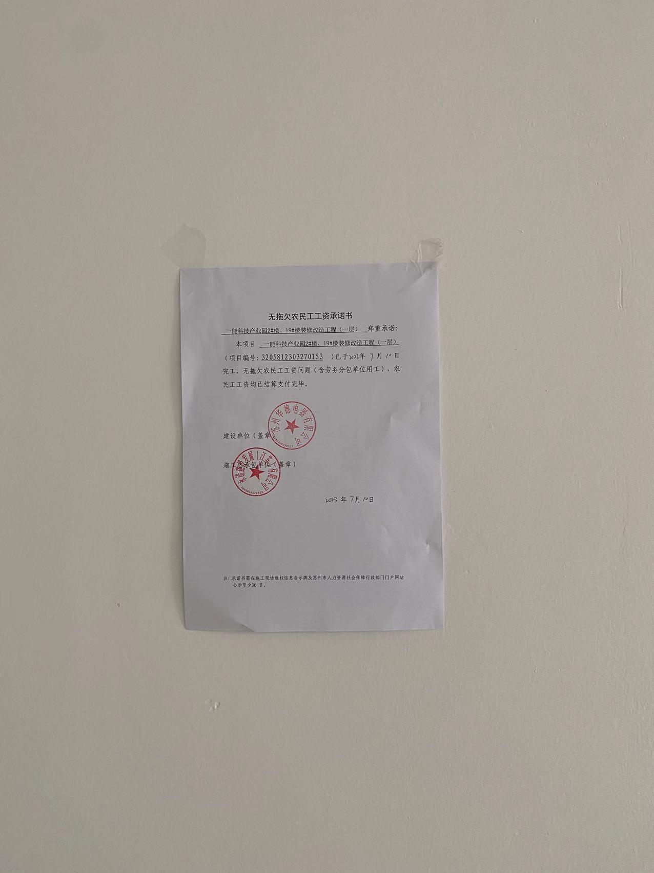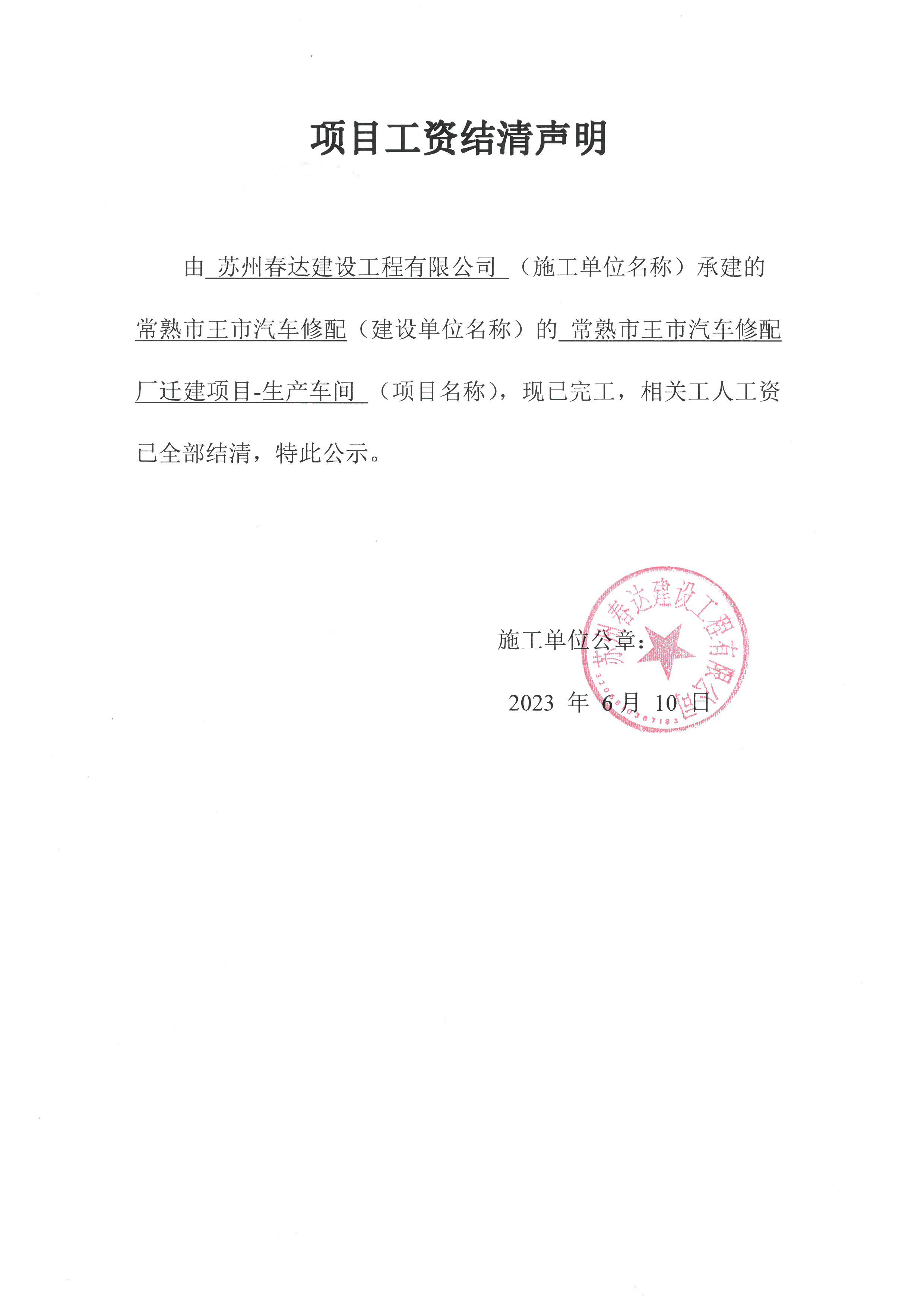 项目工资结清支付公示