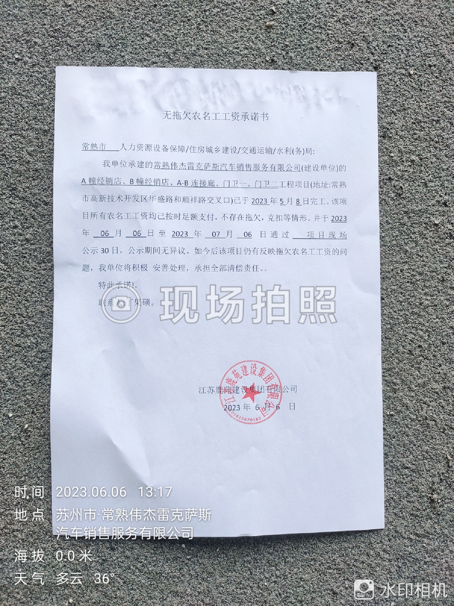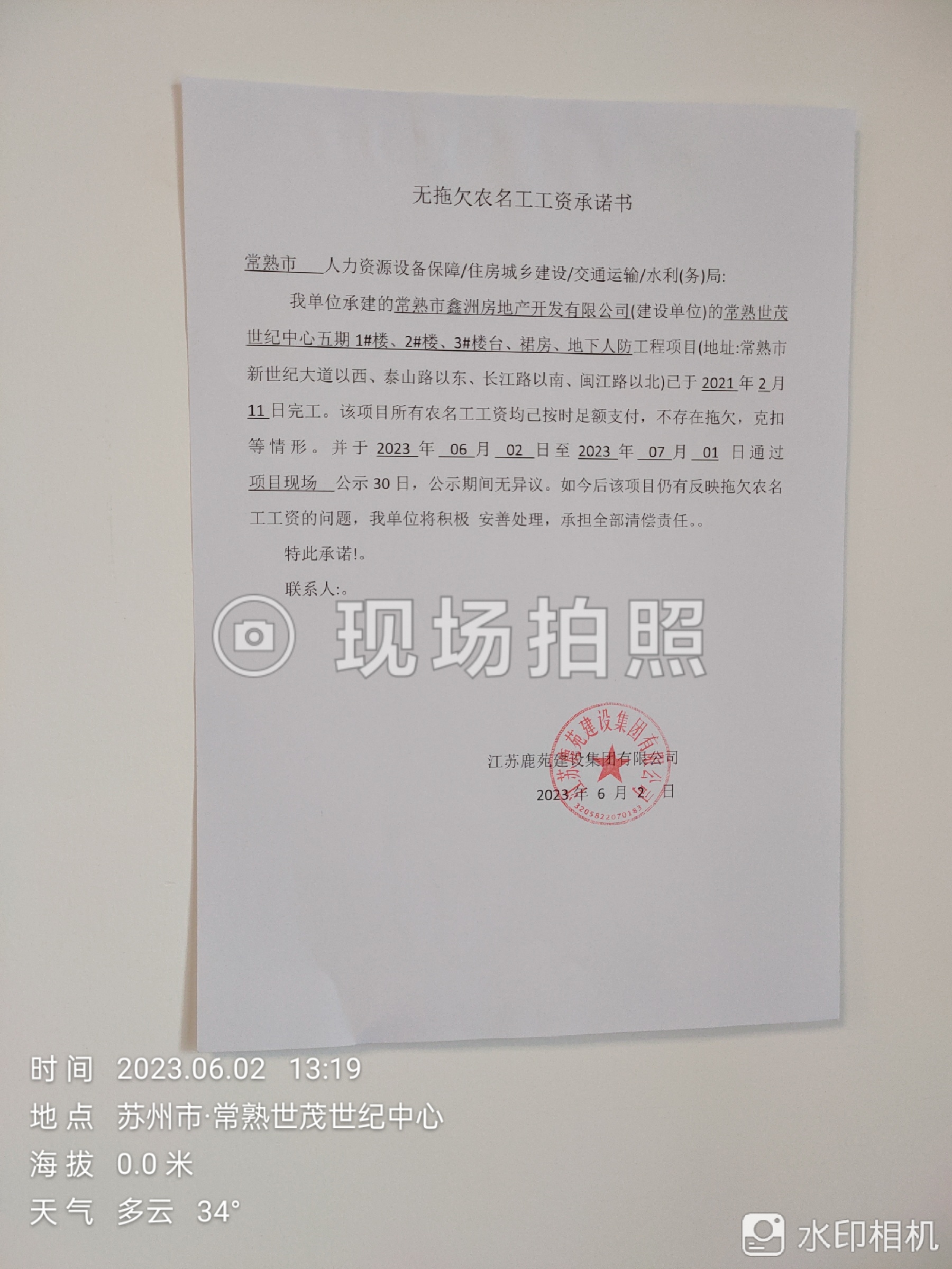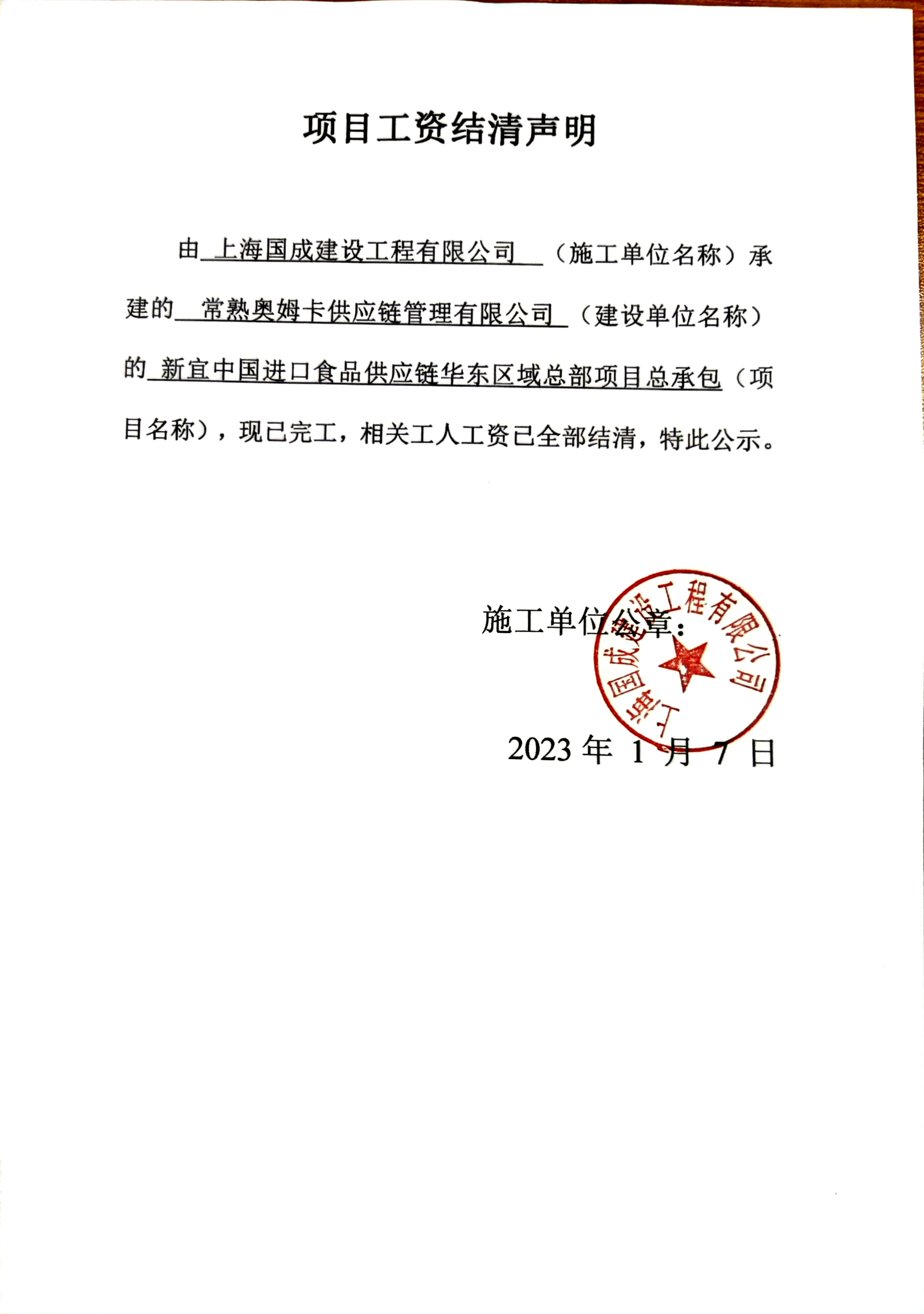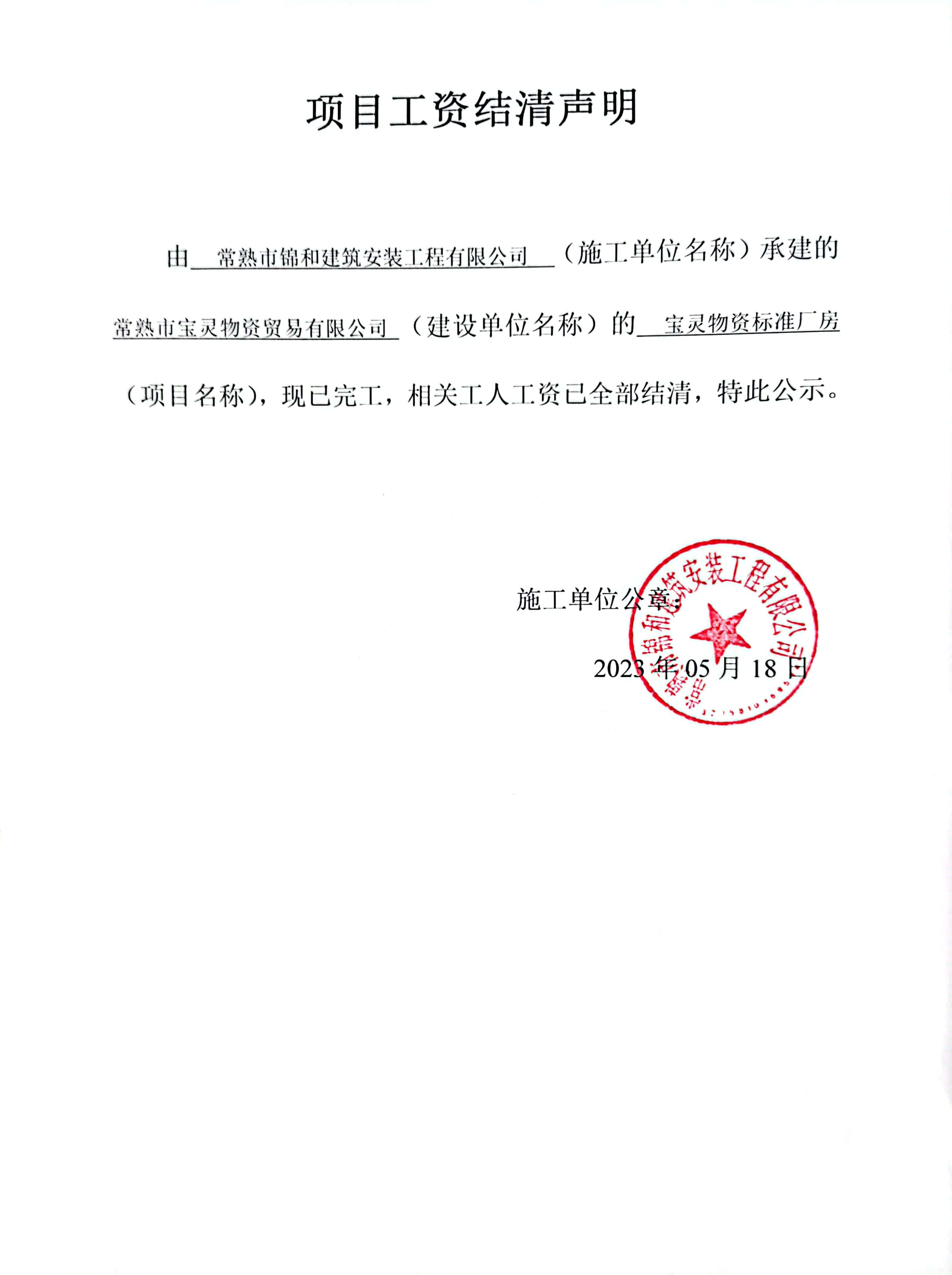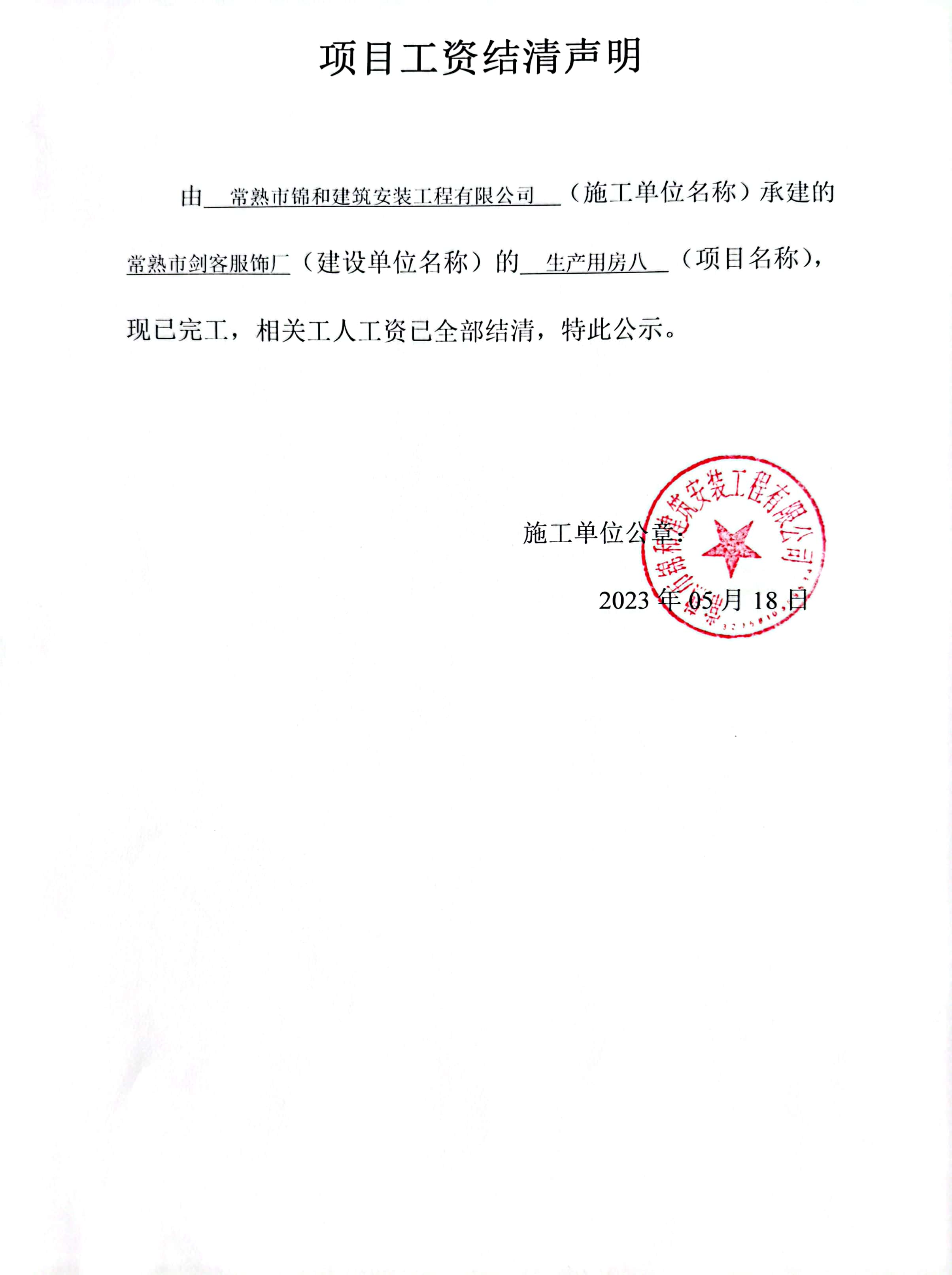 项目工资结清支付公示