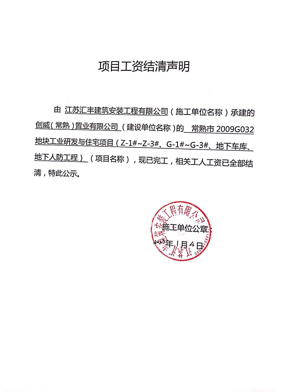 项目工资结清支付公示